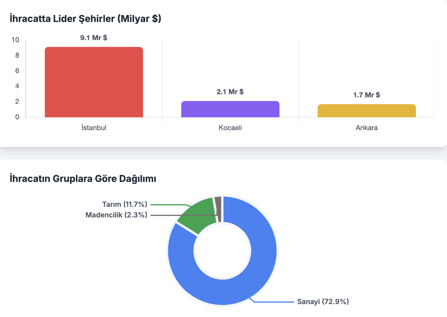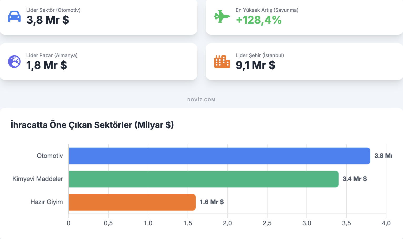 Temmuz ayında otomotiv endüstrisi, 3,8 milyar dolarlık dış satımla en fazla ihracat gerçekleştiren sektör oldu. Savunma ve havacılık sanayisi ise yüzde 128,4’lük artışla ihracatını en çok artıran sektör olarak dikkat çekti. Türkiye İhracatçılar Meclisi tarafından açıklanan verilere göre, 2025 yılının temmuz ayında en fazla ihracat gerçekleştiren sektör, 3,8 milyar dolarlık dış satımla otomotiv endüstrisi olarak kaydedildi. Sanayi grubu içinde otomotivi, 3,4 milyar dolar ile kimyevi maddeler ve mamulleri sektörü, 1,6 milyar dolarlık dış satımla hazır giyim ve konfeksiyon izledi. Savunma ve havacılık sanayisi ise yüzde 128,4’lük artışla temmuz ayının ihracatını en çok artıran sektör olarak öne çıktı. Sanayi grubu ihracatın yüzde 72,9’unu oluşturdu Temmuz ayında sanayi sektörü, Türkiye ihracatının yüzde 72,9’unu gerçekleştirerek 18,2 milyar dolarlık dış satıma ulaştı. Tarım grubu ihracatı, yüzde 2,6’lık artışla 2,9 milyar dolara çıkarken, madencilik grubu ihracatı da yüzde 0,5 artarak 572 milyon dolar olarak hesaplandı. Aynı dönemde sanayi grubunun içinde yer alan sanayi mamulleri ihracatı, yüzde 12,1 artışla 13,6 milyar dolara yükseldi. Kimyevi maddeler ve mamulleri sektörü, yüzde 32,9 oranında artarak 3,4 milyar dolar seviyesine geldi. Otomotiv endüstrisinin ihracatı 3,1 milyar dolardan 3,8 milyar dolara çıkarak yüzde 23 oranında artış gösterdi. Ülkeler ve şehirler bazında ihracat tablosu Temmuz ayında en fazla ihracat yapılan ülkeler sıralamasında ilk sırada 1,8 milyar dolar ile Almanya yer aldı. Almanya’yı 1,4 milyar dolar ile Birleşik Krallık, 1,3 milyar dolar ile Birleşik Arap Emirlikleri takip etti. Toplamda 137 ülkeye ihracat artışı yaşanırken, bu ülkelerden 52’sinde yüzde 50'nin, 107’sinde ise yüzde 10'un üzerinde artış kaydedildi. En fazla ihracat yapan şehirler arasında İstanbul 9,1 milyar dolar ile ilk sırada yer aldı; İstanbul’u 2,1 milyar dolar ile Kocaeli, 1,7 milyar dolar ile Ankara izledi. İhracata yeni katılan firmalar ve parite katkısı Temmuz ayında 1180 firma ilk kez ihracat gerçekleştirdi. Dönemin ihracat performansına döviz kurlarındaki değişimi yansıtan parite etkisi de 825 milyon dolar olarak ölçüldü. Paritenin son üç aydaki toplam katkısı ise 1,6 milyar dolara ulaştı. Genel ihracat toplamı, ihracatçı birliklerinden muaf kalemler ve serbest bölge farkları ile birlikte 24 milyar 951 milyon 877 bin dolar olarak hesaplandı.