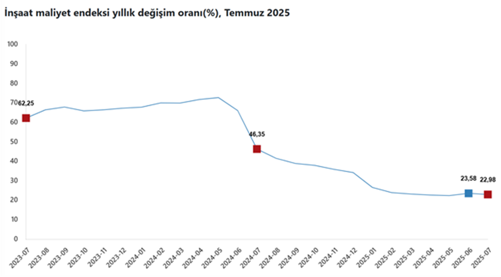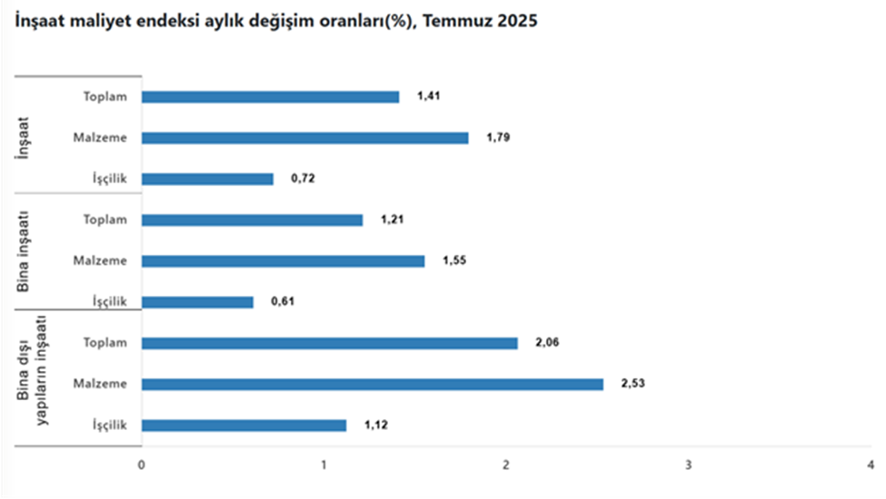 TÜİK verilerine göre inşaat maliyet endeksi, temmuzda aylık bazda yüzde 1,41, yıllık bazda ise yüzde 22,98 artış gösterdi. Türkiye İstatistik Kurumu (TÜİK), Temmuz 2025’e ilişkin inşaat maliyet endeksi verilerini açıkladı. Endeks, temmuzda bir önceki aya kıyasla yüzde 1,41, geçen yılın aynı ayına göre yüzde 22,98 yükseldi. Bir önceki aya göre malzeme endeksi %1,79 arttı, işçilik endeksi %0,72 arttı. Ayrıca bir önceki yılın aynı ayına göre malzeme endeksi %18,98 arttı, işçilik endeksi %31,00 arttı. Kaynak: TÜİK Bina inşaatı maliyeti yıllık %22,81 arttı Bina inşaatı maliyet endeksi, bir önceki aya göre %1,21 arttı, bir önceki yılın aynı ayına göre %22,81 arttı. Bir önceki aya göre malzeme endeksi %1,55 arttı, işçilik endeksi %0,61 arttı. Ayrıca bir önceki yılın aynı ayına göre malzeme endeksi %18,90 arttı, işçilik endeksi %30,35 arttı. Bina dışı yapılarda artış %23,51 oldu Bina dışı yapılar için inşaat maliyet endeksi, bir önceki aya göre %2,06 arttı, bir önceki yılın aynı ayına göre %23,51 arttı. Bir önceki aya göre malzeme endeksi %2,53 arttı, işçilik endeksi %1,12 arttı. Ayrıca bir önceki yılın aynı ayına göre malzeme endeksi %19,21 arttı, işçilik endeksi %33,32 arttı. Kaynak: TÜİK