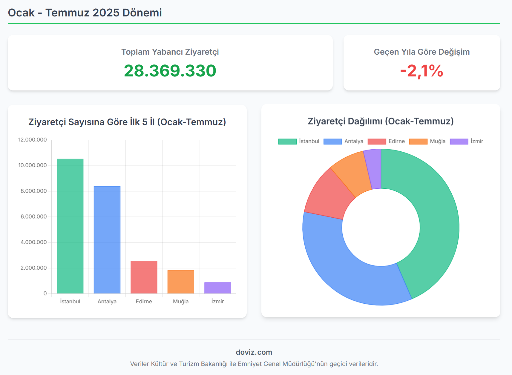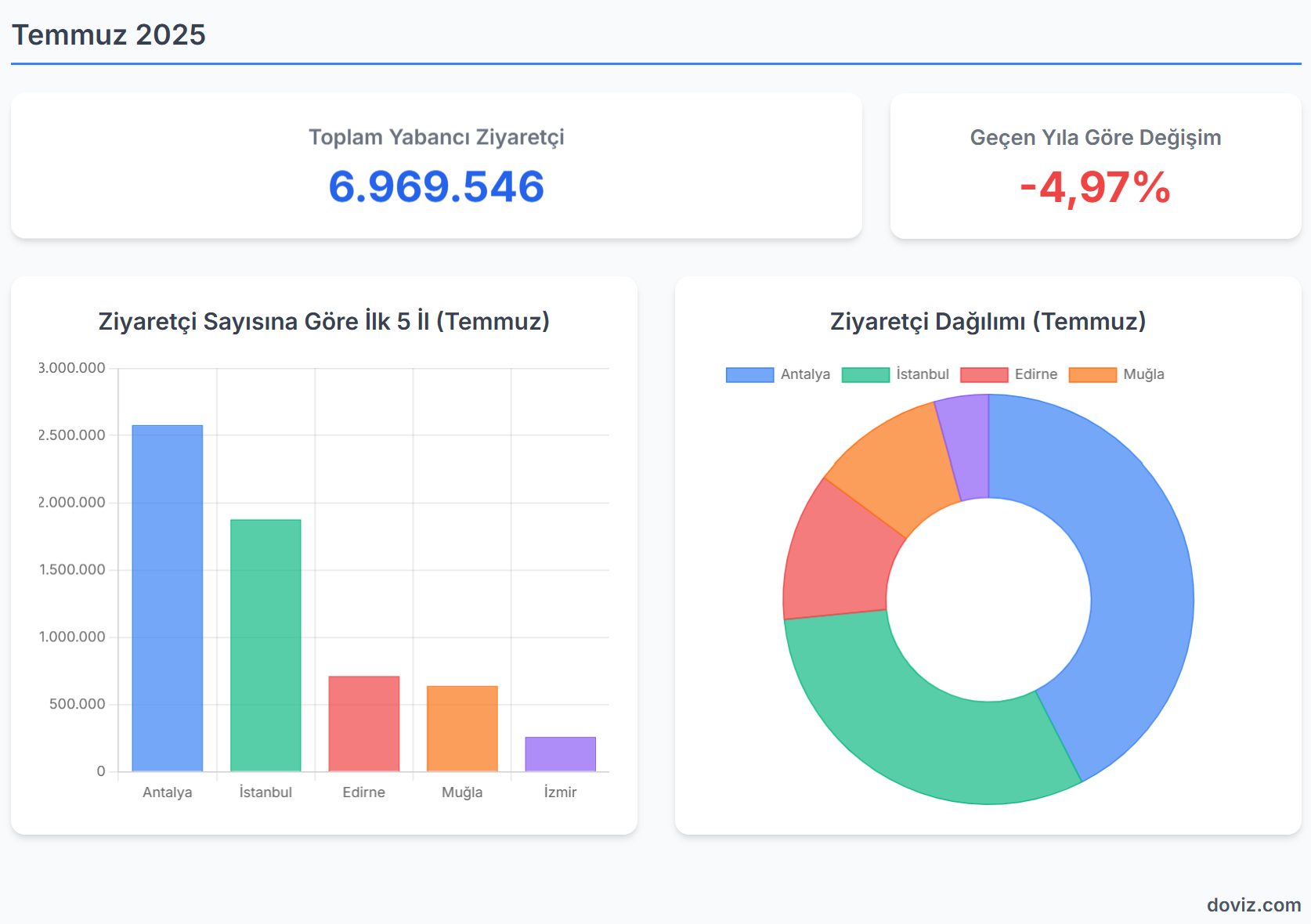 Temmuzda Türkiye'yi ziyaret eden yabancı sayısında geçen yılın aynı ayına göre %4,97 azalış yaşandı. Kültür ve Turizm Bakanlığı tarafından açıklanan ve Emniyet Genel Müdürlüğü'den alınan geçici verilere göre temmuz ayında ülkemizi ziyaret eden yabancı sayısı geçen yılın aynı ayına göre %4,97 oranında azalış göstererek 6.969.546 oldu. Temmuz ayında ülkemize gelen yabancı ziyaretçilerin en çok giriş yaptıkları sınır kapılarının bağlı olduğu iller sıralamasında ilk 5 il aşağıdaki şekilde gerçekleşti: • Antalya %36,96 (2.575.914) • İstanbul %26,96 (1.879.266) • Edirne %10,21 (711.613) • Muğla %9,16 (638.242) • İzmir %3,72 (258.961) İlk 7 ayın bilançosu 2025 yılı Ocak-Temmuz döneminde Ülkemizi ziyaret eden yabancı sayısında geçen yılın aynı dönemine göre %2,1 azalış kaydedildi. Bu dönemde toplam 28.369.330 yabancı ülkeyi ziyaret etti. Ocak-temmuz döneminde Ülkemize gelen yabancı ziyaretçilerin en çok giriş yaptıkları sınır kapılarının bağlı olduğu iller sıralamasında ilk 5 il aşağıdaki şekilde gerçekleşti: • İstanbul %37,06 (10.514.855) • Antalya %29,53 (8.378.836) • Edirne %9,00 (2.552.273) • Muğla %6,46 (1.834.054) • İzmir %3,10 (879.319)