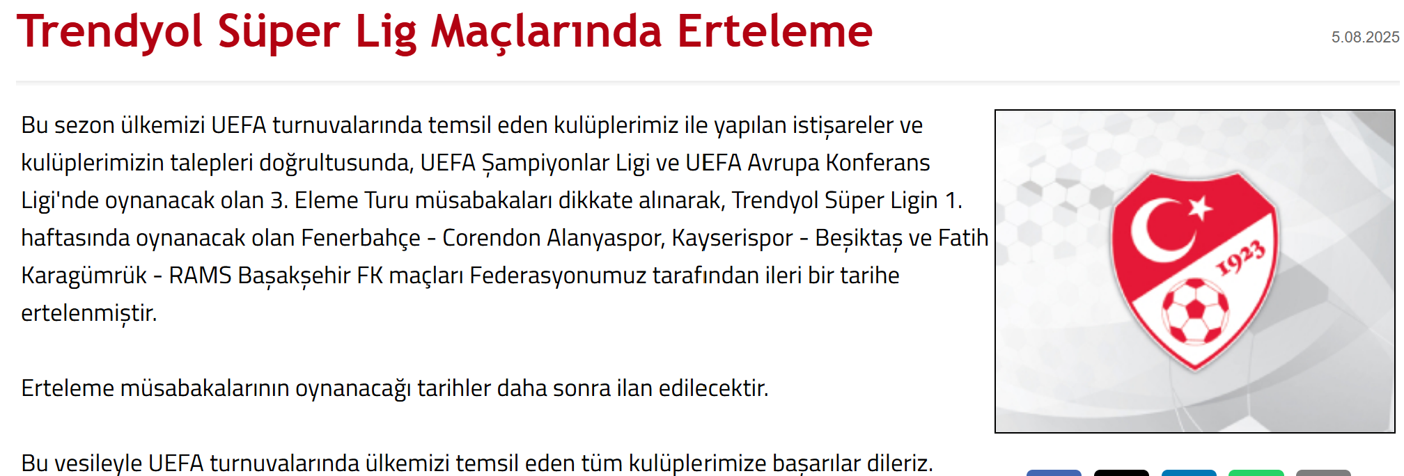Trendyol Süper Ligin 1. Haftasında oynanması gereken Fenerbahçe – Corendon Alanyaspor, Kayserispor – Beşiktaş ve Fatih Karagümrük – RAMS Başakşehir FK müsabakaları, temsilcilerimizin Avrupa Kupalarında oynayacakları 3. Eleme Turu müsabakaları nedeniyle ertelendi. Türkiye Futbol Federasyonu, Trendyol Süper Lig maçlarına ilişkin bir duyuru yayımladı. İlgili duyuruda, temsilcilerimizin Avrupa maçları nedeniyle 3 maçın ertelendiği açıklandı. TFF'nin konuya ilişkin açıklaması şöyle oldu: "Bu sezon ülkemizi UEFA turnuvalarında temsil eden kulüplerimiz ile yapılan istişareler ve kulüplerimizin talepleri doğrultusunda, UEFA Şampiyonlar Ligi ve UEFA Avrupa Konferans Ligi'nde oynanacak olan 3. Eleme Turu müsabakaları dikkate alınarak, Trendyol Süper Ligin 1. haftasında oynanacak olan Fenerbahçe - Corendon Alanyaspor, Kayserispor - Beşiktaş ve Fatih Karagümrük - RAMS Başakşehir FK maçları Federasyonumuz tarafından ileri bir tarihe ertelenmiştir. Erteleme müsabakalarının oynanacağı tarihler daha sonra ilan edilecektir. Bu vesileyle UEFA turnuvalarında ülkemizi temsil eden tüm kulüplerimize başarılar dileriz." [news_id:777154]
