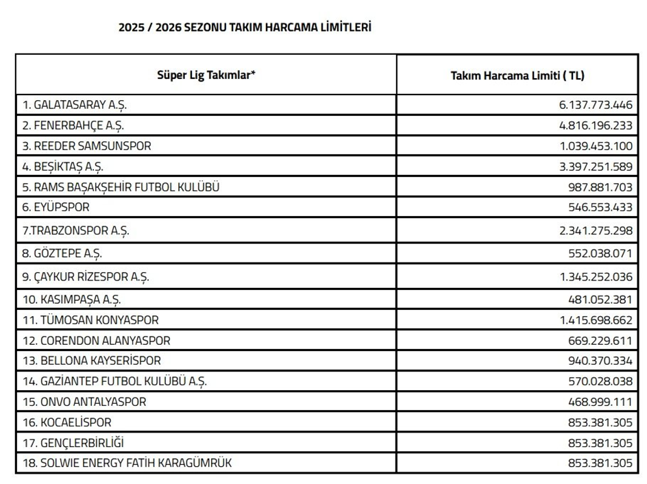 Türkiye Futbol Federasyonu (TFF) 2025/26 sezonu öncesi Süper Lig ekiplerinin harcama limitlerini açıkladı. Türkiye Futbol Federasyonu (TFF), Trendyol Süper Lig’de yer alan kulüplerin 2025-2026 sezonu harcama limitlerini belirledi. TFF’nin açıklamasına göre Galatasaray, 6 milyar 137 milyon 773 bin 446 TL ile en fazla harcama limitine sahip kulüp olurken Fenerbahçe’ye 4 milyar 816 milyon 196 bin 233 TL, Beşiktaş'a 3 milyar 397 milyon 251 bin 589 TL harcama limiti verildi. TFF tarafından açıklanan liste şu şekilde oldu: Kaynak: TFF Limitlerin belirli gerekçelerle yükseltilebileceğine de vurgu yapan TFF, “Kulüpler için belirlenen takım harcama limitleri belirtilen gerekçeler ve usullerle, 15 Aralık tarihine kadar yapılacak başvurular ve her iki transfer ve tescil döneminin son günü en geç saat 18.00'e kadar yapılacak başvurular üzerine Kulüp Lisans Kurulu tarafından artırılabilir.” ifadelerine yer verdi. [news_id:760918]