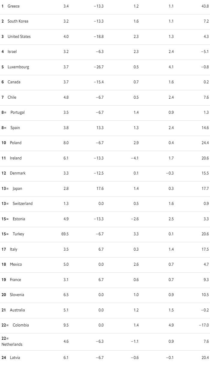 The Economist dergisi, küresel resesyon beklentilerine karşı dirençli bir yıl yaşandığını belirterek, 2023'ün en iyi performans gösteren ekonomilerini açıkladı. The Economist, çekirdek enflasyonun arttığı, enflasyon genişliğinin düştüğü ve borsaların yüzde 20 oranında yükseldiği bir ortamda 35 ülkenin ekonomik performansını inceledi. Bu kriterler doğrultusunda yapılan değerlendirmede, Yunanistan geçtiğimiz yıla benzer şekilde bu yıl da listenin zirvesinde yer aldı. Yunanistan’ın çekirdek enflasyonunda yüzde 3,4’lük bir artış ve enflasyon genişliğinde yüzde 13,3’lük bir düşüş kaydedilirken, GSYH’de yüzde 3,3’lük bir büyüme ve borsada yüzde 43,8’lik belirgin bir artış görüldü. Listede ayrıca Güney Kore ikinci, ABD üçüncü, Kanada altıncı, Şili ise yedinci sırada yer alırken; Avrupanın en büyük ekonomisi Almanya’nın ise yirmi yedinci sırada bulunması dikkat çekti. Türkiye, sıralamada on beşinci sırayı Estonya ile paylaşırken ülkelerin sıralamadaki konumu ise şöyle listelendi: **Sütunlar sırasıyla yüzde olarak çekirdek enflasyonu, enflasyon genişliğini, GSYH’yi, istihdamı ve hisse fiyatlarındaki değişimi gösteriyor.