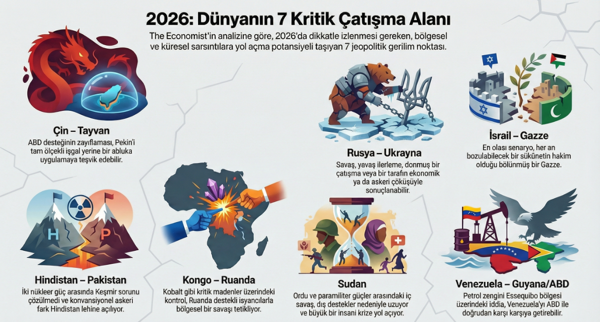 Son yıllarda aktif silahlı çatışmaların sayısında büyük artış meydana geldi. Bu çatışmaların çoğunda çok sayıda insan hayatını kaybetti. The Economist ise 2026'ya girilmesine sayılı gün kala gelecek yılın en tehlikeli bölgelerini listeledi. Son 10 yılda dünyadaki aktif silahlı çatışmaların sayısı hızla artarken bazı gerilimler henüz açık savaşa dönüşmese de hem bulunduğu bölgeyi ve hem de dünyayı derinden sarsma potansiyeli taşıyor. The Economist dergisi de bu risklerin en yüksek olduğu 2026 yılında yakından izlenmesi gereken 7 çatışma alanını listeledi: Çin–Tayvan Listenin ilk sırasında Çin ve Tayvan arasındaki gerilim yer aldı. ABD'nin eski Temsilciler Meclisi Başkanı Nancy Pelosi'nin 2022 yılında Tayvan'a düzenlediği ziyaretin ardından başlayan gerilim, Çin Devlet Başkanı Şi Cinping'in Tayvan'a askeri müdahale tehdidiyle birlikte üst seviyeye çıkmıştı. Rusya'nın Ukrayna savaşında karşılaştığı zorlukların Çin'i durdurmuş olabileceğini dile getiren The Economist, Trump yönetiminin Tayvan'a desteğinin zayıflamasının Beijing'i yeniden harekete geçirebileceğini söyledi. Bununla birlikte doğrudan işgal yerine abluka ihtimalinin daha yüksek olduğu aktarılan analizde, böyle bir senaryoda Çin ile ABD ve müttefiklerinin karşı karşıya gelme riskinin bulunduğu bildirildi. Hindistan–Pakistan Bu yıl Hindistan'da 26 turistin öldüğü saldırı iki ülkeyi son yılların en ciddi krizine sürüklemişti. Karşılıklı sınır ötesi saldırılar düzenlenmiş, ihtilaflı bölge Keşmir'de 50'den fazla kişi öldürülmüştü. Bunların ardından ABD öncülüğünde ateşkes sağlanmış olsa da Economist bunun "kırılgan" olduğunun altını çizdi. Dergi, Pakistan'da Savunma Bakanı Asım Münir'in yetkilerinin artması ve Hindistan'ın ekonomisinin hızla büyümesinin yarattığı askeri uçurumun iki ülkeyi ince bir çizgi üzerinde tuttuğunu savundu. İlgili analizde, ABD'nin Hindistan ile girdiği gümrük savaşının da arabuluculuk faaliyetlerini zorlaştırdığı aktarıldı. Rusya–Ukrayna Rusya'nın kayıplarının 2. Dünya Savaşı'ndaki Amerikan kayıplarını aştığını belirten The Economist, savaşın yıpratma denklemine dönüştüğünü paylaştı. Savaşta iki farklı risk senaryosu olduğuna dikkat çeken dergi, Ukrayna cephesinde ya da siyasetinde çöküşün meydana gelmesinin Rusya'nın hız kazanmasını sağlayabileceğini ya da Rus ekonomisinin petrol tesislerine yönelik saldırılar nedeniyle büyük kayıplar yaşayabileceğini söyledi. The Economist, her iki senaryoda da küresel güvenlik açısından büyük sonuçların ortaya çıkacağını belirtti. İsrail–Gazze Gazze’de savaşın yeniden başlamasının göz ardı edilmeyecek bir ihtimal olduğunu savunan The Economist, Gazze’nin yerle bir olduğunun altını çizerken, İsrail’in bölgenin yarısını kontrol etmeye devam ettiğini paylaştı. Bu gelişmeler ışığında ekimde sağlanan ateşkesin her an bozulabileceğine dikkat çeken The Economist, bu durumda en olası senaryonun bölünmüş bir Gazze olacağını aktardı. Ancak, Trump yönetiminin barış planına yatırım yapmaya devam etmesi halinde bölge için umutların canlı kalmaya devam edeceği savunuldu. Ayrıca uluslararası barış gücünün bölgede konuşlanmasının da kentin yeniden inşasına yönelik umutları artırabileceği ifade edildi. Kongo–Ruanda hattı Ruanda ise bu yıl Kongo'daki M23 isyancılarını desteklemiş hatta Goma'nın ele geçirilmesi sürecine de bizzat asker göndermişti. The Economist analizinde, Kongo'nun doğusundaki etnik gerilimler ve zengin yeraltı kaynaklarının tam teşekküllü bir savaşı tetikleyebileceği belirtildi. Altın ve kobalt gibi madenlerin de iki ülke arasındaki gerilimi gelecek yıl daha da artırabileceği öngörüldü. Sudan Sudan Silahlı Kuvvetleri (SAF) ile Hızlı Destek Kuvvetleri (HDK) arasındaki savaş şiddetini korurken arada kalan milyonlarca sivil güvenli bölgelere kaçma mücadelesi veriyordu. The Economist, Sudan ve HDK'yı destekleyen bölgesel aktörlerin tavırlarının çatışmanın devamı üzerinde belirleyici rol üstleneceğini paylaştı. Venezuela- ABD The Economist listesinde son olarak Venezuela- ABD gerilimi yer aldı. Trump yönetimi, uyuşturucuyla mücadele adı altında Venezuela açıklarına büyük bir askeri yığınak yapmış, bu hareketin amacı ise Maduro rejimini sıkıştırmak olarak açıklanmıştı. Hava saldırılarının olası olduğuna dikkat çeken The Economist, Maduro'ya yönelik özel operasyonların seçenekler dahilinde bulunduğunu aktardı. İlgili analizde Venezuela'nın Guyana'daki Essequibo bölgesine yönelik hak iddialarında geri adım atmamasının da ABD ile doğrudan karşı karşıya gelme riskini artırdığı paylaşıldı. [news_id:791706]
