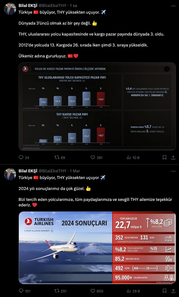 Türk Hava Yolları (THY), uluslararası havacılık sektöründeki büyümesini istikrarlı bir şekilde devam ettirerek küresel ölçekte en büyük üç hava yolu şirketinden biri oldu. Uluslararası yolcu kapasitesi açısından dünya sıralamasında yüzde 3,4 pazar payı ile üçüncü sıraya yükseldi. Yolcu Taşımada Süregelen Yükseliş THY'nin uluslararası yolcu kapasitesindeki ilerleyişi yıllar içinde istikrarlı bir artış gösterdi. 2012’de yüzde 1,9 pazar payı ile dünya genelinde 13’üncü sırada yer alırken, 2017’de bu oran yüzde 2,4’e yükselerek 10’unculuğa ulaştı. 2023 yılına gelindiğinde ise pazar payı yüzde 3,5’e ulaşarak şirketi dünya genelinde üçüncü sıraya taşıdı. THY Genel Müdürü Bilal Ekşi, şirketin yükselişine dair verileri paylaştı ve şirketin uluslararası taşımacılıkta büyük bir ivme yakaladığını belirtti. Kargo Taşımacılığında Dikkat Çeken Yükseliş THY, kargo taşımacılığı alanında da önemli bir büyüme kaydetti. Taşınan Kargo Ton Kilometre (ÜKTK) verilerine göre 2012 yılında yüzde 1,3 pazar payı ile dünya genelinde 26’ncı sırada bulunurken, 2017’de yüzde 2,5 ile 14’üncü sıraya yükseldi. 2019’da yüzde 3,7 ile sekizinci sıraya, 2023’te ise yüzde 5,2 ile dördüncü sıraya ulaştı. Geçtiğimiz yıl ise pazar payı yüzde 5,7’ye yükselerek şirketi dünya genelinde üçüncü sıraya taşıdı. THY’nin kargo taşımacılığındaki hızlı yükselişi, şirketin hem operasyonel hem de lojistik kapasitesindeki gelişimi ortaya koydu.