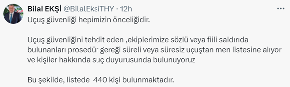 Uçuş güvenliğinin öncelikleri olduğunu ifade eden Türk Hava Yolları (THY) Genel Müdürü Bilal Ekşi, bu zamana kadar 440 kişinin kara listeye alındığını açıkladı. Dün İstanbul-Londra seferini yapan THY uçağının seferi öncesi kabin ekibine hakaret eden yolcu havayolu şirketi tarafından kara listeye alınarak uçuşlardan men edilmişti. Uçuş güvenliğinin öncelikleri olduğunu ifade eden THY Genel Müdürü Bilal Ekşi yaptığı paylaşımda şu ifadeleri kullandı: “Uçuş güvenliğini tehdit eden, ekiplerimize sözlü ve fiili saldırıda bulunanları prosedür gereği süreli veya süresiz uçuştan men listesine alıyor ve kişiler hakkında suç duyurusunda bulunuyoruz. Bu şekilde listede 440 kişi bulunuyor." Kaynak: Bilal Ekşi - X