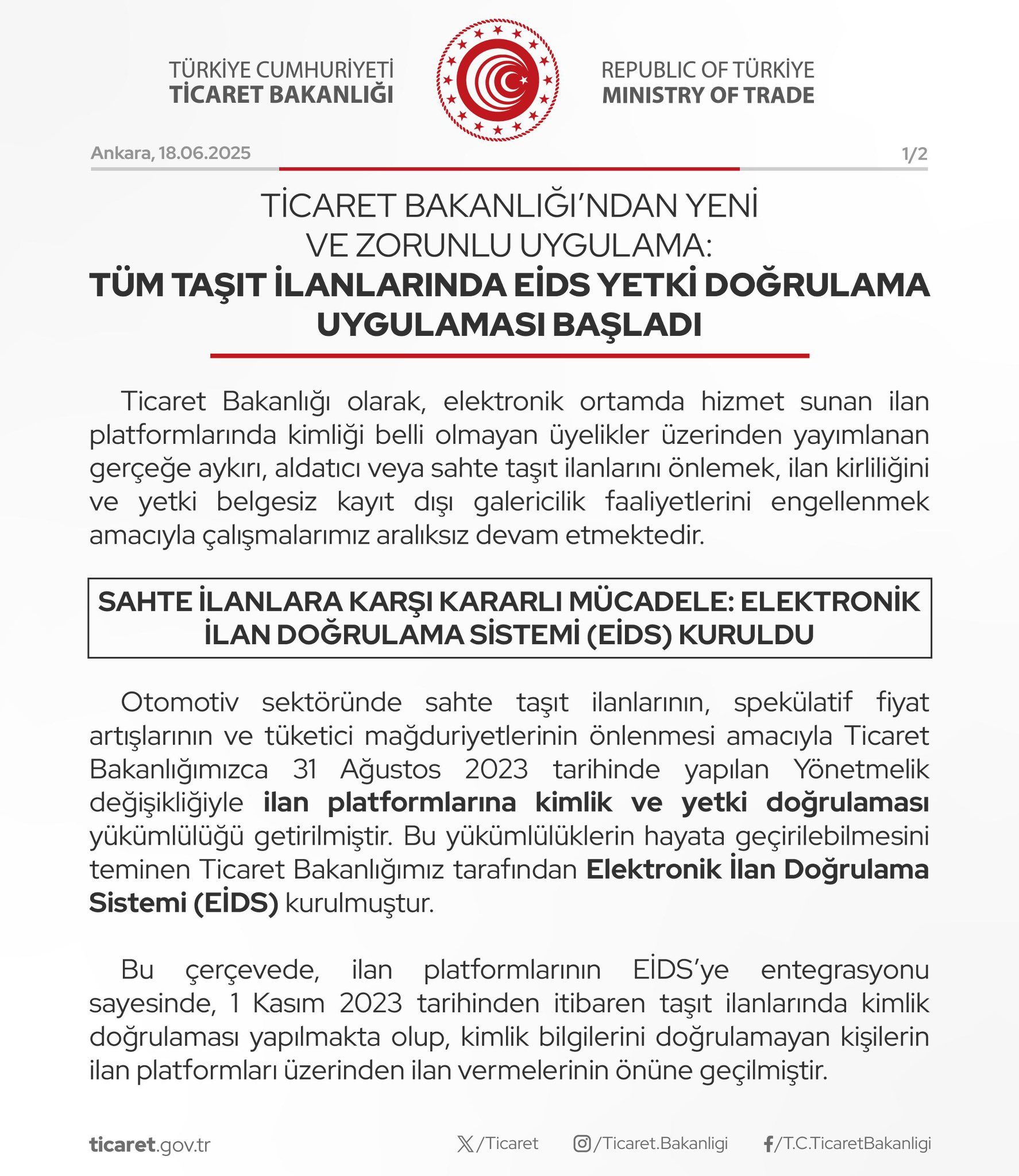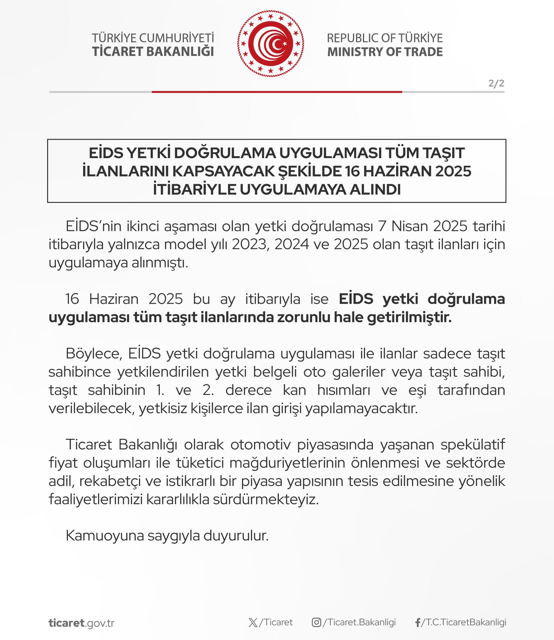 Ticaret Bakanlığı 16 Haziran 2025 itibarıyla EİDS yetki doğrulama uygulamasının tüm taşıt ilanlarında zorunlu hale getirildiğini hatırlattı. Ticaret Bakanlığı tarafından devreye sokulan Elektronik İlan Doğrulama Sistemi (EİDS) artık tüm taşıt ilanlarında zorunlu olacak. EİDS’nin ikinci aşaması olan yetki doğrulaması 7 Nisan 2025 tarihi itibarıyla yalnızca model yılı 2023, 2024 ve 2025 olan taşıt ilanları için uygulamaya alınmıştı. 16 Haziran 2025 itibarıyla ise EİDS yetki doğrulama uygulaması tüm taşıt ilanlarında zorunlu hale getirildi. Yeni düzenlemeyle, EİDS yetki doğrulama uygulaması ile ilanlar sadece taşıt sahibince yetkilendirilen yetki belgeli oto galeriler veya taşıt sahibi, taşıt sahibinin 1. ve 2. derece kan hısımları ve eşi tarafından verilebilecek, yetkisiz kişilerce ilan girişi yapılamayacak.