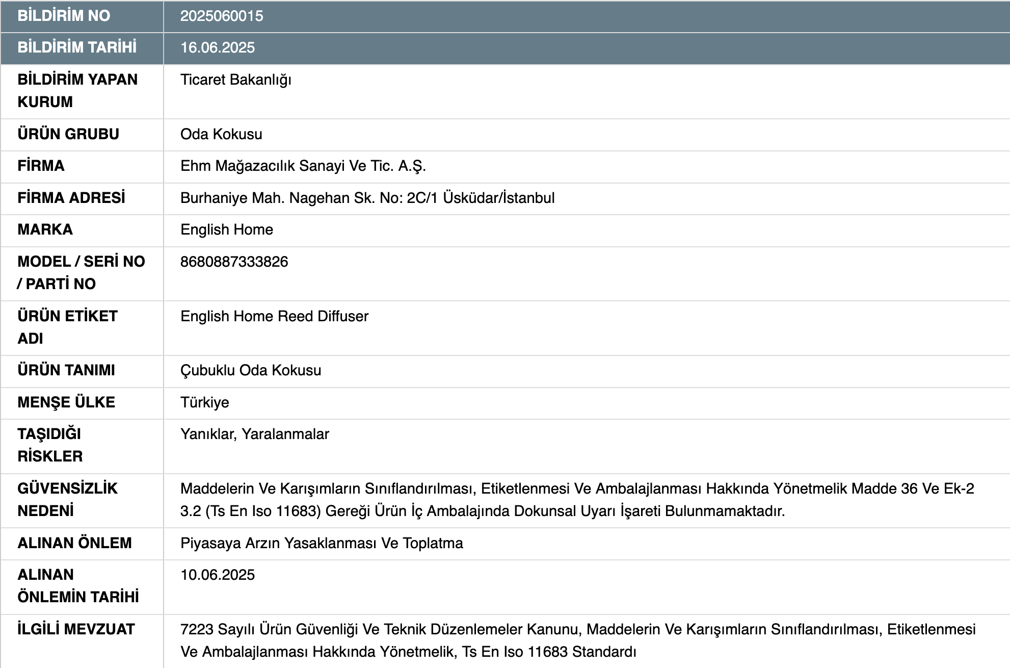 Ticaret Bakanlığı, English Home markasına ait çubuklu oda kokusunun güvenli olmadığına hükmetti. Bakanlık, söz konusu ürünün insan sağlığı açısından risk teşkil ettiğini belirterek satışının durdurulmasına ve piyasadan toplatılmasına karar verdi. Ticaret Bakanlığı, 16 Haziran 2025 tarihinde “Güvensiz Ürün Bilgi Sistemi” üzerinden yayımladığı açıklama ile tüketici sağlığına zarar verebilecek nitelikteki bazı ürünleri kamuoyuna duyurdu. Söz konusu açıklamada English Home'un çubuklu oda kokusu da yer aldı. Bakanlığın yaptığı bildirimde, ürünün piyasada dolaşımda olmasının sağlık açısından riskler taşıdığı belirtilirken, bu riskler arasında “yanıklar” ve “yaralanmalar” gibi fiziksel zararların olabileceğine dikkat çekildi. Satış Yasağı ve Toplatma Kararı Bakanlık tarafından yayımlanan resmi bilgilendirmede, English Home'un piyasaya sunduğu oda kokusu hakkında satış yasağı getirilmiş ve mevcut stokların raflardan toplatılmasına yönelik işlem başlatılmıştı. Ürünün tehlike arz etme gerekçesiyle kamuoyunun bilgilendirildiği listede yer alması, ürünün yasal mevzuata uygun şekilde üretilmediğini de ortaya koydu. Güvensizlik Gerekçesi ve Yasal Mevzuat İhlali Ticaret Bakanlığı’nın internet sitesinde yer alan teknik bilgilere göre, söz konusu oda kokusu için yapılan değerlendirmede güvensizlik gerekçesi olarak, “‘Maddelerin Ve Karışımların Sınıflandırılması, Etiketlenmesi Ve Ambalajlanması Hakkında Yönetmelik Madde 36 Ve Ek-2 3.2 (TS EN ISO 11683) Gereği Ürün İç Ambalajında Dokunsal Uyarı İşareti Bulunmamaktadır’” ifadesine yer verildi. Bu açıklama doğrultusunda, ürünün taşıdığı kimyasal içeriklerin temas halinde tehlikeli olabileceği, fakat iç ambalajında engelli bireyler için gerekli olan dokunsal uyarı işaretlerinin yer almadığı belirtildi.