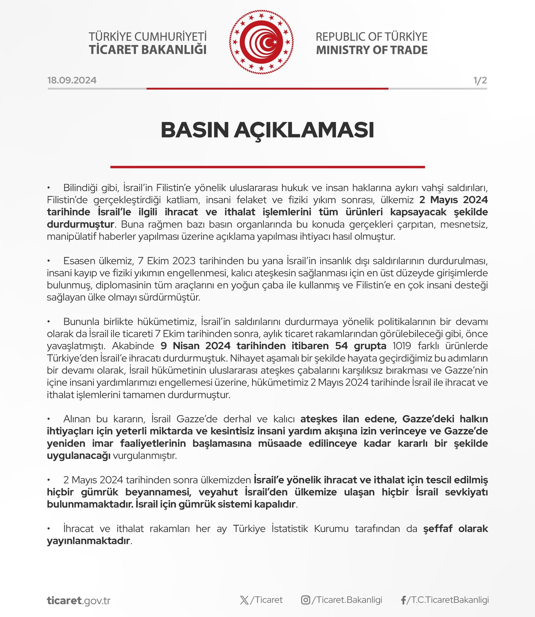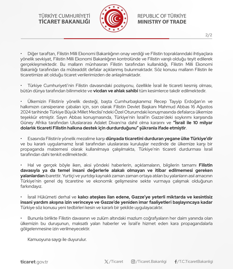 Ticaret Bakanlığı, "2 Mayıs 2024 tarihinden sonra ülkemizden İsrail’e yönelik ihracat ve ithalat için tescil edilmiş hiçbir gümrük beyannamesi veyahut İsrail’den ülkemize ulaşan hiçbir İsrail sevkiyatı bulunmamaktadır." açıklamasında bulundu. Ticaret Bakanlığı, 2 Mayıs 2024 tarihinden bu yana Türkiye'den İsrail’e yönelik ihracat ve ithalat için tescil edilmiş hiçbir gümrük beyannamesi ya da İsrail’den Türkiye'ye ulaşan hiçbir İsrail sevkiyatının bulunmadığını açıkladı. Ticaret Bakanlığı, İsrail'e yönelik 2 Mayıs 2024 tarihinde alınan ihracat ve ithalat işlemlerini tüm ürünleri kapsayacak şekilde durduklarını anımsatarak, bu konuda çıkan haberlere ilişkin, "İsrail'e yönelik ihracat ve ithalat için tescil edilmiş hiçbir gümrük beyannamesi veyahut İsrail'den ülkemize ulaşan hiçbir sevkiyatı bulunmamaktadır. İsrail için gümrük sistemi kapalıdır." ifadelerini kullandı. Kaynak: Ticaret Bakanlığı - X [news_id:746029]