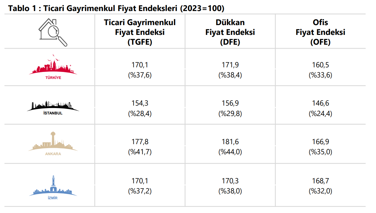 Ticari Gayrimenkul Fiyat Endeksi (TGFE), 2024'ün 4. çeyreğinde bir önceki çeyreğe göre yüzde 7,3, yıllık bazda nominal olarak yüzde 37,6 artarken, reel olarak yıllık yüzde 6,2 azaldı. Türkiye Cumhuriyet Merkez Bankası (TCMB) tarafından geçtiğimiz yılın 4. çeyreğine ilişkin TGFE verileri açıklandı. TGFE, 2024'ün 4. çeyreğinde bir önceki çeyreğe göre yüzde 7,3, yıllık bazda nominal olarak yüzde 37,6 artarken, reel olarak yıllık bazda yüzde 6,2 düştü. Türkiye genelinde, 4. çeyrekte bir önceki çeyreğe göre yüzde 7,7 yükselen Dükkan Fiyat Endeksi, bir önceki yılın aynı dönemine göre nominal olarak yüzde 38,4 artış kaydetmesine karşın reel olarak yüzde 5,6 geriledi. Söz konusu çeyrekte bir önceki çeyreğe göre yüzde 5 artan Ofis Fiyat Endeksi, bir önceki yılın aynı çeyreğine göre nominal olarak yüzde 33,6 yükselirken, reel olarak yüzde 8,9 azalış gösterdi. Üç büyük il için TGFE değişimine bakıldığında 2024'ün 4. çeyreğinde bir önceki çeyreğe göre İstanbul, Ankara ve İzmir'de endeks, sırasıyla yüzde 6,3, yüzde 4,5 ve yüzde 7,6 yükseldi. Endeks değerleri, bir önceki yılın aynı çeyreğine göre İstanbul, Ankara ve İzmir’de sırasıyla yüzde 28,4, yüzde 41,7 ve yüzde 37,2 arttı. Kaynak: TCMB