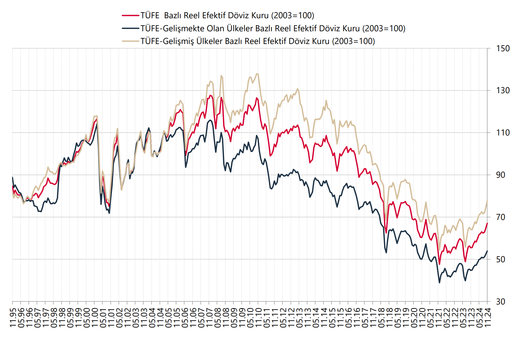 TÜFE bazlı reel efektif kuru endeksi kasımda 67,03 puana çıkarak 45 ayın en yüksek seviyesine ulaştı. Türkiye Cumhuriyet Merkez Bankası (TCMB), TÜFE bazlı reel efektif kuru endeksi kasım verisini açıkladı. Ekimde 64,84 seviyesinde olan TÜFE bazlı reel efektif kuru endeksi, kasım ayında 67,03 puana yükseldi. Böylelikle üst üste üçüncü ayda da artış gösteren Türk Lirası reel döviz kuru endeksi, son 45 ayın en yüksek seviyesine çıkmış oldu. Kaynak: TCMB Reel efektif döviz kuru nedir? Reel efektif döviz kuru, Türk Lirası'nın satın alma gücünde olan değişimleri ortaya koyan bir veridir. Reel efektif kurun artışı Türk Lirası'nın değer kazandığını, Türk mallarının yabancı mallar cinsinden fiyatının arttığını gösteriyor. Reel efektif kurdaki düşüş yabancı mallar cinsinden fiyatın düşüşüne işaret ediyor. Reel efektif döviz kuru nasıl hesaplanır? Türkiye'nin dış ticaretinde önemli paya sahip ülkelerin para birimlerinden oluşan sepete göre, ikili ticaret akımları kullanılarak ağırlıklandırılan Türk Lirasının ortalama değeri ile nominal efektif döviz kuru hesaplanıyor. Nominal efektif döviz kurundan da nispi fiyat etkileri arındırılarak reel efektif döviz kuruna (REK) ulaşılıyor. REK, TÜFE, ÜFE ve birim işgücü maliyetlerden biriyle arındırılarak üç farklı alt endeks oluşturuyor. TCMB enflasyon hedefi kapsamında TÜFE bazlı REK'i esas alıyor. [news_id:753436]