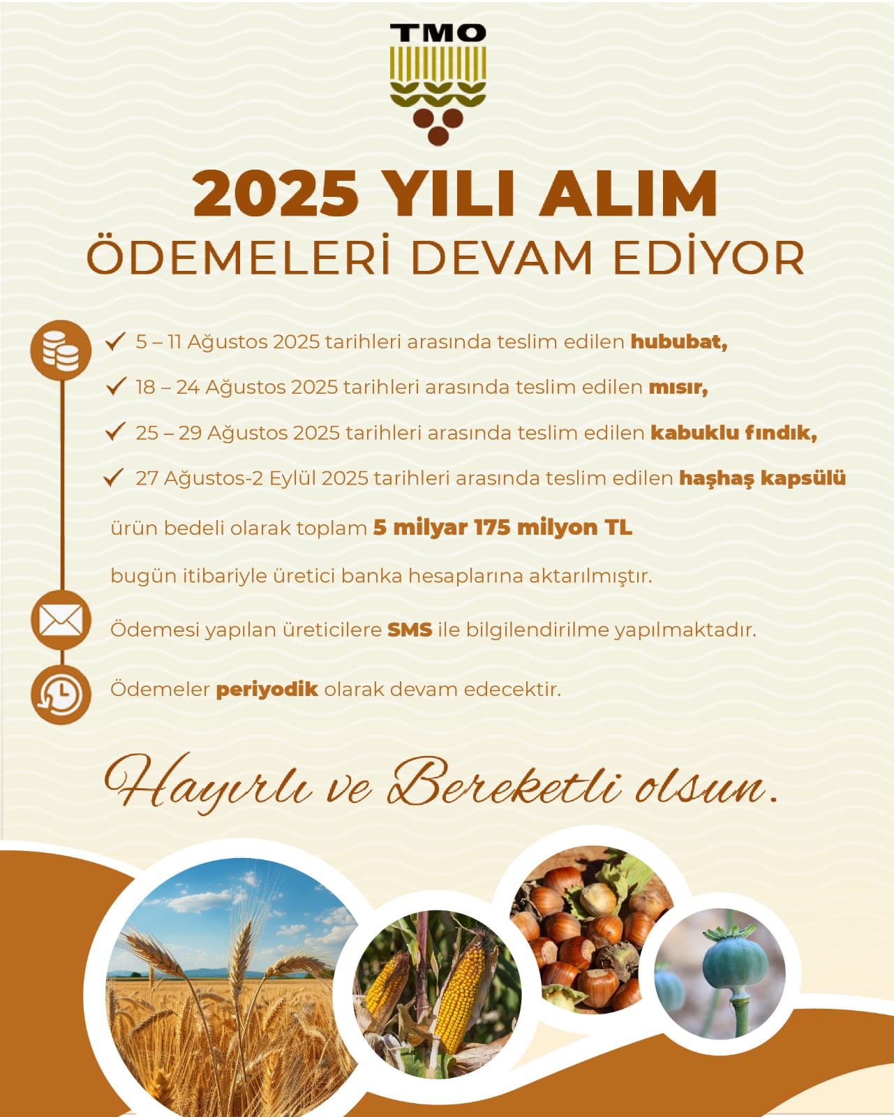 Toprak Mahsulleri Ofisi (TMO), alımı yapılan hububat, mısır, kabuklu fındık ve haşhaş kapsülünün bedeli olan toplam 5 milyar 175 milyon liranın bugün üreticilerin hesaplarına yatırıldığını bildirdi. TMO'nun NSosyal'deki hesabından yapılan paylaşımda, bu yılın ürün alım ödemelerine ilişkin bilgi verildi. 5-11 Ağustos'ta hububat, 18-24 Ağustos'ta mısır, 25-29 Ağustos'ta kabuklu fındık ve 27 Ağustos-2 Eylül'de haşhaş kapsülü alımı yapıldığı belirtilen açıklamada, bu ürünlerin bedeli olan 5 milyar 175 milyon liranın bugün üreticilerin hesaplarına yatırıldığı ifade edildi. Paylaşımda, üreticilerin kısa mesajla bilgilendirildiği ve ödemelerin periyodik olarak devam edeceği belirtildi. [news_id:777257]