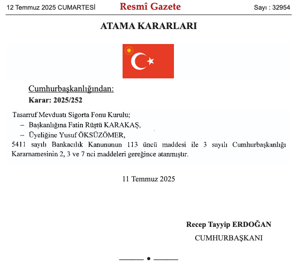 12 Temmuz 2025 tarihli ve 32954 sayılı Resmî Gazete’de yayımlanan Cumhurbaşkanlığı kararıyla, Tasarruf Mevduatı Sigorta Fonu (TMSF) Kurulu Başkanlığı görevine Fatin Rüştü Karakaş yeniden atandı. Karar, Cumhurbaşkanı Recep Tayyip Erdoğan’ın imzasıyla 11 Temmuz 2025 tarihinde alındı. Aynı kararda Yusuf Öksüzömer’in de TMSF Kurulu üyeliğine tekrar atandığı belirtildi. Atamalar, 5411 sayılı Bankacılık Kanunu’nun 113. maddesi ile 3 sayılı Cumhurbaşkanlığı Kararnamesi’nin 2, 3 ve 7. maddeleri uyarınca gerçekleştirildi. Yeni dönemde Karakaş ve Öksüzömer, kurumun yürüttüğü finansal yeniden yapılandırma ve risk yönetimi süreçlerinde aktif rol üstlenmeye devam edecek. Fatin Rüştü Karakaş kimdir? 1968 yılında Rize'de doğan Fatin Rüştü Karakaş, Marmara Üniversitesi İktisadi ve İdari Bilimler Fakültesi Maliye Bölümü mezunu oldu. İstanbul Üniversitesi'nden Para ve Banka yüksek lisans derecesi alan Fatin Rüştü Karakaş, 1992 yılında Teftiş Kurulu'nda Müfettiş Yardımcısı olarak göreve başladığı Şekerbank'ta 2013 yılı Ocak ayına kadar çeşitli görevler üstlendi. Fatin Rüştü Karakaş, 2013 yılı Ocak ayından Kasım ayına kadar Şekerbank T.A.Ş. Personeli Munzam Sosyal Güvenlik ve Yardımlaşma Sandığı Vakfı'nda Genel Sekreter olarak görev yaptı ve Kasım 2013'te Şekerbank T.A.Ş. Genel Müdür Yardımcısı olarak atandı. Bir süre Bankacılık Düzenleme ve Denetleme Kurumunda (BDDK) Kurul Üyeliği yapan Fatin Rüştü Karakaş, 2019'da TMSF Kurul Üyeliğine atandı.