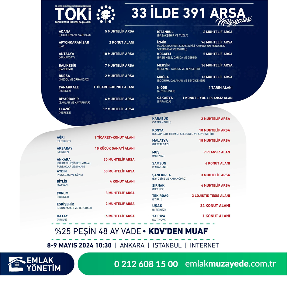 Çevre, Şehircilik ve İklim Değişikliği Bakanlığı Toplu Konut İdaresi Başkanlığı (TOKİ), 33 ilde 391 muhtelif arsayı açık artırma yöntemiyle satışa sunacak. İşte açık artırmaya ilişkin detaylar.. Çevre, Şehircilik ve İklim Değişikliği Bakanlığı Toplu Konut İdaresi Başkanlığı (TOKİ) İstanbul, Ankara ve İzmir’in de aralarında bulunduğu 33 ildeki 391 muhtelif arsayı satışa sunuyor. Buna göre Adana, Afyonkarahisar, Ağrı, Aksaray, Ankara, Antalya, Aydın, Balıkesir, Bitlis, Bursa, Çanakkale, Çorum, Diyarbakır, Eskişehir, Elazığ, Hatay, İstanbul, İzmir, Karabük, Kocaeli, Konya, Malatya, Mersin, Muş, Muğla, Niğde, Sakarya, Samsun, Şanlıurfa, Şırnak, Tekirdağ, Uşak ve Yalova’da bulunan 391 arsa, açık artırma yöntemiyle satılacak. Açık artırma, 8 Mayıs 2024 Çarşamba ve 9 Mayıs 2024 Perşembe günleri 10:30 saatlerinde iki ayrı oturum halinde yapılacak. Oturumlar, TOKİ İstanbul Hizmet Binası ve Holiday Inn Otel ve Konferans Salonu’nda gerçekleştirilecek. Ayrıca internetten de "emlakmuzayede.com.tr" adresinden teklif verilebilecek. KDV’den muaf yüzde 25 peşinat 48 ay vade Alıcılar, konut, ticaret, sanayi ve turizm tesis alanı alanları niteliğindeki arsalara yüzde 25 peşinat 48 ay vade ile sahip olabilecek. Ayrıca arsalar KDV’den muaf şekilde satılacak. Satışa ilişkin detaylı bilgiye “toki.gov.tr” ile “emlakmuzayede.com.tr” internet adresinden ve 0 212 608 15 00 numaralı telefondan ulaşılabilecek. Katılım teminatı ne kadar? Arsa ihalelerine katılım için gerekli teminat miktarları ise şöyle: 📌 Muhammen bedeli 0-500.000 TL arası olan her arsa için ayrı ayrı 15.000-TL, 📌 Muhammen bedeli 500.001 – 2.500.000 TL arası olan her arsa için ayrı ayrı 75.000-TL, 📌 Muhammen bedeli 2.500.0001 - 10.000.000 TL arası olan her arsa için ayrı ayrı 350.000-TL, 📌 Muhammen bedeli 10.000.001 – 25.000.000 TL arası olan her arsa için ayrı ayrı 750.000-TL, 📌 Muhammen bedeli 25.000.001 – 50.000.000 TL arası olan her arsa için ayrı ayrı 1.500.000-TL, 📌 Muhammen bedeli 50.000.001 TL’ den fazla olan her arsa için ayrı ayrı 3.000.000-TL. Hangi ilde kaç arsa satışa sunulacak? Kaynak: Emlak Müzayede - X [news_id:721410]