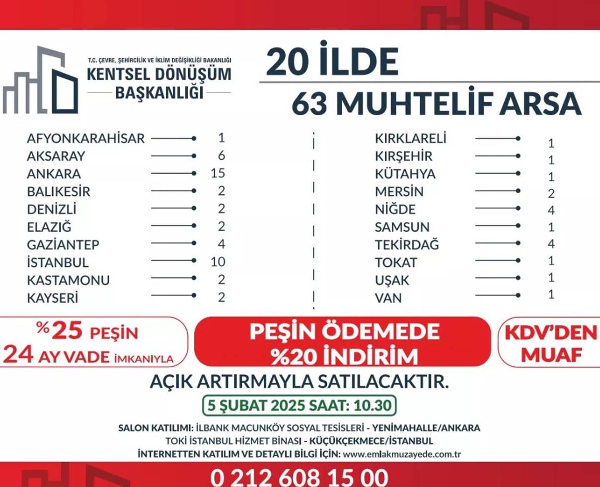 Çevre Şehircilik ve İklim Değişikliği Bakanlığı, 20 ilde 63 muhtelif arsayı satışa çıkarıyor. Buna göre arsalara sahip olmak isteyen kişiler, 5 Şubat tarihinde KDV’den muaf şekilde tekliflerini iletebilecek. Toplu Konut İdaresi Başkanlığı (TOKİ), 20 ilde toplam 63 muhtelif arsayı açık artırma yöntemi ile satışa çıkaracak. Çevre, Şehircilik ve İklim Değişikliği Bakanlığı Toplu Konut İdaresi Başkanlığı (TOKİ) duyurusuna göre ilgili arsalar, 5 Şubat 2025 tarihinde yapılacak ihalelerle yeni sahiplerini bulacak. Arsa satışı gerçekleştirilecek iller ise şöyle olacak: Afyonkarahisar, Aksaray, Ankara, Balıkesir, Denizli, Elazığ, Gaziantep, İstanbul, Kastamonu, Kayseri, Kırklareli, Kırşehir, Kütahya, Mersin, Niğde, Samsun, Tekirdağ, Tokat, Uşak, Van. Kaynak: Emlakmuzayede Açık artırmalar, Ankara İlkbank Macunköy Sosyal Tesisleri ile TOKİ İstanbul Hizmet Binası'nda yapılacak. Ayrıca internetten üzerinden de teklif verilebilecek. Açık artırmaya katılmak isteyen gerçek ve tüzel kişilerin ise Emlak Yönetim Hizmetleri ve Ticaret A.Ş’nin banka hesabına belirlenen teminat bedellerini yatırmaları gerekecek. Teminatlar da arsanın muhammen bedeline göre değişiklik gösterecek. İlgili tarihlerde teminat bedelini yatırarak açık artırmayı kazanan alıcılar, bedelin yüzde 25’i peşin, kalan kısmını 24 ay vadeli olacak şekilde ödeyerek arsa sahibi olabilecek. [news_id:739906]