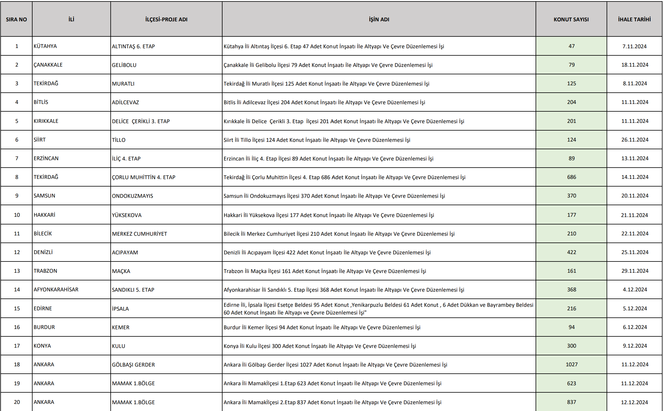 Çevre, Şehircilik ve İklim Değişikliği Bakanlığı Toplu Konut İdaresi Başkanlığı (TOKİ), "250 Bin Sosyal Konut Projesi" kapsamındaki sosyal konutların ihale tarihlerinin belirlendiğini bildirdi. TOKİ'nin sosyal medya hesabından yapılan paylaşımda, Cumhuriyet tarihinin en büyük sosyal konut hamlesinin hız kesmeden devam ettiği belirtildi. 250 Bin Sosyal Konut Projesi kapsamında tüm sosyal konutların ihale tarihlerinin belirlendiği bilgisi verilen açıklamada, "Herkes için konut, insanca yaşam ve ekonomik olarak ulaşılabilir konut hedefimizle geleceğin Türkiye'sini güvenle inşa ediyoruz." ifadesi kullanıldı. İlgili ihale takviminde ise ihale sürecinin bugün başlayarak önümüzdeki yılın haziran ayına kadar devam edeceği aktarıldı. Tarihi en yakın 20 ihale de şöyle sıralandı: Kaynak: TOKİ [news_id:749951]