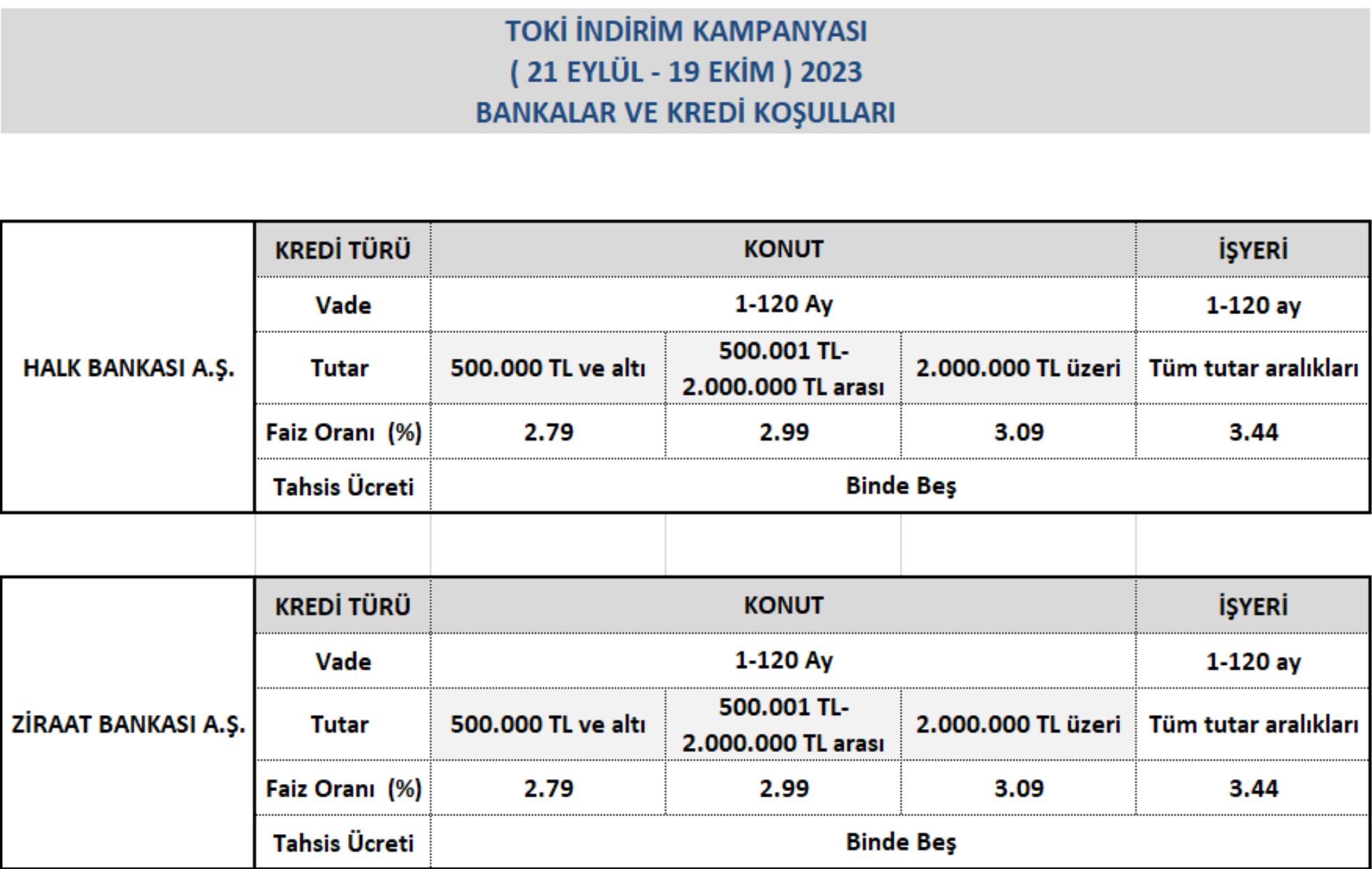 TOKİ'nin, Haziran 2022'den önce yapılan iş yeri ve konutlar için başlattığı indirim kampanyası bugün sona eriyor. TOKİ'nin, 21 Haziran 2022 öncesinde yapılan evlerle ilgili indirim kampanyası bugün sona erecek. Bu tarihten sonra yapılacak borç kapatmalarında söz konusu indirim oranından yararlanılması mümkün olmayacak. Borcunu peşin ödeyen konut ve iş yeri alıcıları için yüzde 25 oranında indirim yapılacak. Kısmi ödeme imkanı Yüzde 25 indirim kampanyasından bütün borç bakiyesini kapatamayacak vatandaşlar da yararlanabilecek. Borcun tamamını kapatamayacak vatandaşlar borç bakiyesinin yüzde 25’inden az olmamak şartıyla yaptıkları peşin ödemelerde yüzde 25 indirim kampanyasından faydalanabilecek. İndirim uygulaması kapsamına alınan projelerdeki konut ve iş yeri alıcılarının başvuru tarihi itibarıyla öncelikle borç kapatmanın yapıldığı aya ait taksit ödemelerini yapmış olması zorunluluğu bulunuyor. Ayrıca geriye dönük taksit ve emlak vergisi borcu bulunmaması gerekiyor. Kampanyadan geri ödeme taksitleri en geç 2022 yılı Haziran ayı sonuna kadar başlamış olan konut ve iş yerleri alıcıları yararlanabilecek. Taksit sayısı 12 ay ve daha az kalan konut ve iş yeri alıcıları indirim kampanyasından yararlanamayacak. Kampanyadan faydalanmak isteyen konut ve iş yeri alıcıları Gayrimenkul Satış Sözleşmesini imzalamış oldukları aracı bankalardan konut kredisi kullanabilecekler. Kampanyadan yararlanma şartları İndirim uygulaması kapsamına alınan projelerdeki konut ve iş yeri alıcılarının başvuru tarihi itibarıyla öncelikle borç kapatmanın yapıldığı aya ait taksit ödemelerini yapmış olması zorunluluğu bulunuyor. Ayrıca geriye dönük taksit ve emlak vergisi borcu bulunmaması gerekiyor. Kampanyadan ayrıca geri ödeme taksitleri en geç 2022 yılı Haziran ayı sonuna kadar başlamış olan konut ve iş yerleri sahipleri yararlanabiliyor. Taksit sayısı 12 ay ve daha az kalan konut ve iş yeri alıcıları indirim kampanyasından faydalanamıyor. Öte yandan, kampanyadan faydalanmak isteyen konut ve iş yeri sahipleri, Gayrimenkul Satış Sözleşmesini imzalamış oldukları aracı bankalardan konut kredisi kullanabiliyor. Kampanya tarihinden sonra yapılacak borç kapatma ve kısmi ödemelerde ise söz konusu indirim oranından yararlanılması mümkün olmuyor. Bankalar ve kredi koşulları Bugün sona erecek kampanyaya yönelik bankaların sunduğu kredilerin koşulları ise şöyle: Kaynak: TOKİ [news_id:711234]