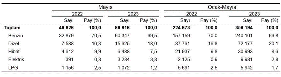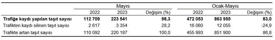 Trafiğe kaydı yapılan taşıt sayısı bir önceki aya göre %24,5, geçen yılın aynı ayına göre %98,3 arttı. Türkiye İstatistik Kurumu (TÜİK) tarafından yapılan açıklamaya göre, mayıs ayında 223 bin 541 adet taşıtın trafiğe kaydı yapıldı. Mayıs ayında trafiğe kaydı yapılan taşıtların %45,4'ünü motosiklet, %38,8'ini otomobil, %8,7'sini kamyonet, %4,4'ünü traktör, %2,0'ını kamyon, %0,4'ünü minibüs, %0,2'sini otobüs ve %0,1'ini özel amaçlı taşıtlar oluşturdu. Trafiğe kaydı yapılan taşıt sayısı bir önceki aya göre %24,5 arttı Mayıs ayında trafiğe kaydı yapılan taşıt sayısı bir önceki aya göre özel amaçlı taşıtta %263,4, traktörde %29,5, otomobilde %28,2, motosiklette %25,1, kamyonda %13,7, kamyonette %9,7, minibüste %4,9 artarken otobüste %19,8 azaldı. Trafiğe kaydı yapılan taşıt sayısı, Mayıs 2021-Mayıs 2023 Taşıt sayısı geçen yılın aynı ayına göre %98,3 arttı Mayıs ayında geçen yılın aynı ayına göre trafiğe kaydı yapılan taşıt sayısı özel amaçlı taşıtta %189,3, minibüste %125,5, motosiklette %125,0, kamyonda %101,7, otomobilde %86,2, otobüste %84,2, kamyonette %68,3 ve traktörde %50,5 arttı. Trafiğe kayıtlı toplam taşıt sayısı Mayıs ayı sonu itibarıyla 27 milyon 334 bin 424 oldu Mayıs ayı sonu itibarıyla trafiğe kayıtlı taşıtların %53,5'ini otomobil, %16,4'ünü motosiklet, %16,0'ını kamyonet, %7,8'ini traktör, %3,4'ünü kamyon, %1,8'ini minibüs, %0,8'ini otobüs ve %0,3'ünü özel amaçlı taşıtlar oluşturdu. Mayıs ayında 1 milyon 104 bin 572 adet taşıtın devri yapıldı Mayıs ayında devri(1) yapılan taşıtların %67,2'sini otomobil, %15,6'sını kamyonet, %10,7'sini motosiklet, %2,8'ini traktör, %1,8'ini kamyon, %1,4'ünü minibüs, %0,3'ünü otobüs ve %0,2'sini özel amaçlı taşıtlar oluşturdu. Mayıs ayında 86 bin 816 adet otomobilin trafiğe kaydı yapıldı Mayıs ayında trafiğe kaydı yapılan otomobillerin %13,9'u Fiat, %12,3'ü Renault, %10,6'sı Volkswagen, %7,0'ı Peugeot, %6,9'u Opel, %5,1'i Hyundai, %4,2'si Citroen, %4,1'i Dacia, %4,1'i Ford, %4,0'ı Toyota, %3,6'sı Skoda, %2,9'u Nissan, %2,9'u BMW, %2,4'ü Honda, %2,4'ü Mercedes-Benz, %2,3'ü Audi, %2,1'i Chery, %2,0'ı Kia, %1,2'si Volvo, %1,0'ı MG ve %4,8'i diğer markalardan oluştu. Ocak-Mayıs döneminde 863 bin 955 adet taşıtın trafiğe kaydı yapıldı Ocak-Mayıs döneminde bir önceki yılın aynı dönemine göre trafiğe kaydı yapılan taşıt sayısı %83,0 artarak 863 bin 955 adet olurken, trafikten kaydı silinen taşıt sayısı %24,9 azalarak 12 bin 55 adet oldu. Böylece Ocak-Mayıs döneminde trafikteki toplam taşıt sayısında 851 bin 900 adet artış gerçekleşti. Trafiğe kaydı yapılan ve trafikten kaydı silinen motorlu kara taşıtları, Mayıs 2023 Otomobillerin %66,8'i "benzin" yakıtlıdır Ocak-Mayıs döneminde trafiğe kaydı yapılan 359 bin 194 adet otomobilin %66,8'i benzinli, %20,1'i dizel, %8,6'sı hibrit, %2,8'i elektrikli ve %1,7'si LPG'lidir. Mayıs ayı sonu itibarıyla trafiğe kayıtlı 14 milyon 630 bin 136 adet otomobilin ise %36,5'i dizel, %34,4'ü LPG'li, %27,6'sı benzinli, %1,1'i hibrit ve %0,2'si elektriklidir. Yakıt türü bilinmeyen(2) otomobillerin oranı ise %0,2'dir. Trafiğe kaydı yapılan otomobillerin yakıt cinslerine göre dağılımı, Mayıs 2023 En fazla 1300 ve altı silindir hacimli otomobil kaydı yapıldı Ocak-Mayıs döneminde trafiğe kaydı yapılan 359 bin 194 adet otomobilin %35,8'i 1300 ve altı, %24,5'i 1401-1500, %20,6'sı 1301-1400, %8,9'u 1501-1600, %6,7'si 1601-2000, %0,8'i 2001 ve üstü motor silindir hacmine sahiptir. Otomobillerin 115 bin 930'u "gri" renklidir Ocak-Mayıs döneminde trafiğe kaydı yapılan 359 bin 194 adet otomobilin %32,3'ü gri, %32,2'si beyaz, %12,0'ı mavi, %9,3'ü siyah, %7,3'ü kırmızı, %3,0'ı yeşil, %2,5'i turuncu, %0,6'sı kahverengi ve %0,6'sı sarı renklidir.