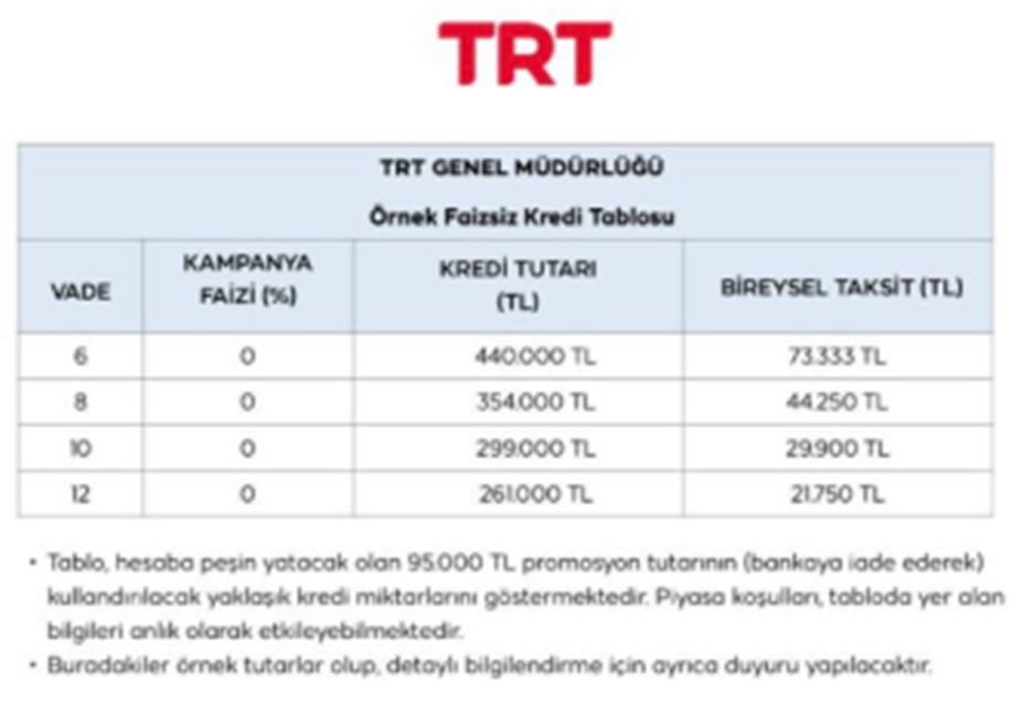 TRT, çalışanlarının maaş promosyonu için Halkbank ile protokol imzaladıklarını duyurdu. TRT çalışanlarının maaş promosyonu belli oldu. TRT tarafından personele yapılan duyuruda, Halkbank ile protokol imzalandığı bildirildi. İlgili protokole göre çalışanlara 95 bin TL nakit, 15 bin TL ParafPara olmak üzere toplam 110 bin TL destek sağlanacak. Banka promosyonunu tercih etmeyen çalışanlara ise 6, 8, 10, 12 ay seçenekli sıfır faizli kredi imkânı sunulacak. TRT’nin promosyonlara ilişkin çalışanlarına gönderdiği duyurunun tamamı şöyle oldu: "Yeni dönemi kapsayan maaş ve promosyon protokolü, Halkbank (Türkiye Halk Bankası A.Ş.) ile imzalanmıştır. Yapılan protokol kapsamında, promosyon tutarı 95.000 TL nakit ve 15.000 TL ParafPara olmak üzere toplam 110.000 TL olarak belirlenmiş olup; nakit promosyon tutarı Aralık 2025 maaşının ardından tek seferde, ParafPara tutarı ise Ocak, Şubat ve Mart 2026’da üç eşit parça halinde hesaplara yatırılacaktır. Protokol süresince: Banka şubesi, ATM, internet/mobil/telefon bankacılığı aracılığıyla havale, FAST ve mesai saatleri içerisinde yapılacak EFT işlemlerinden, maaş hesaplarına tanımlanacak elektrik, doğalgaz, telekomünikasyon, su vb. otomatik fatura ödeme talimatlarından, banka kartı, kredi kartı, çalışanın eşi ve çocukları için talep edilecek ek kartlardan ücret alınmayacaktır. Banka promosyonunu tercih etmeyen çalışma arkadaşlarımıza, 6, 8, 10, 12 ay seçenekli sıfır faizli kredi imkânı sunulmuştur. (Örnek kredi tutarı ve ödemeler için ekteki dosyaya bakabilirsiniz.) Kurumumuzun yoğun çalışmaları sonucu yapılan anlaşmanın tüm çalışma arkadaşlarımıza hayırlı olmasını dileriz." [news_id:789119]
