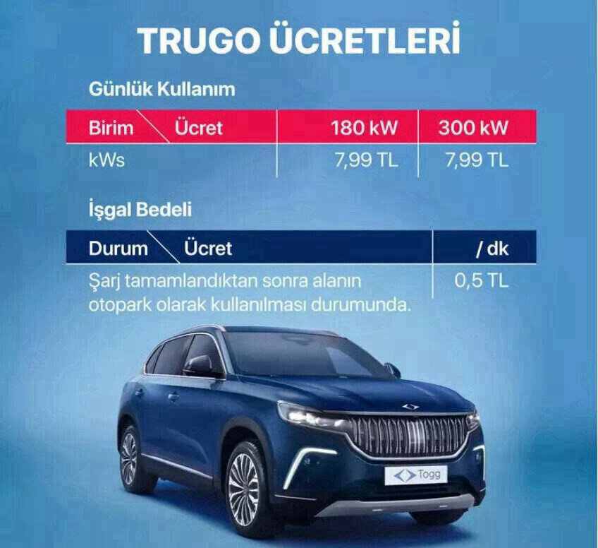 Togg'un ilk teslimlerinin bu ay içerisinde yapılması planlanırken, araçlarını teslim alacak şanslı kişilerin en çok merak ettiği konu 'Togg’un kaç paraya şarj olacağı' oldu. Togg'un şarj istasyonu ağı olan Trugo ise güncel fiyat listesini yayımladı. İşte detaylar... Togg’un T10X modeli, 2023 yılında şanslı 20 bin kişi teslim edilecek. Togg ayrıca bu kişilerin yanı sıra yaklaşık 20 bin kişi için de yedek liste oluşturuldu. 2023 yılı için planlanan teslimatlarda iptallerin yaşanması halinde, yedek listedeki kullanıcıların devreye alınması bekleniyor. Bu sebeple bu 40 bin kişinin en çok merak ettiği konular arasında Togg'un şarj ücreti yer alıyor. Togg'un şarj istasyonu ağı olan Trugo ise şarj fiyat listesini yayımladı. Buna göre, Togg'da kW/s başına birim ücret 7,99 lira oldu. Ayrıca şarj tamamlandıktan sonra şarj istasyon alanının otopark olarak kullanılması halinde de dakikada 0,5 lira ücret alınacak. Togg'un kısa ve uzun menzilli akıllı cihazlarında menziller batarya kapasitelerine göre değişiklik gösterirken; kısa menzilli Togg 52,4 kWh bataryasıyla 314 kilometre yol alabiliyor. Uzun menzilli Togg ise 88,5 kWh bataryasıyla 523 kilometre yol gidebiliyor. Buna göre, 88,5 kWs batarya kapasitesi bulunan 523 kilometre uzun menzilli Togg'un şarj maliyeti 707,1 lira, kilometre başına harcadığı enerji ise 1,35 lira olacak. Togg ne kadar sürede şarj olacak? Yüksek performanslı şarj cihazlarıyla bir bataryanın doluluk oranının 30 dakikadan daha kısa sürede yüzde 20’den yüzde 80’e ulaşacağı bildirildi. Kaynak: Trugo