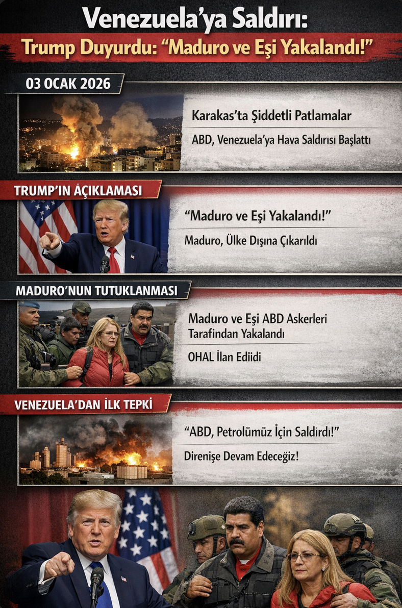 Venezuela’nın başkenti Karakas’ta sabah saatlerinde art arda patlama sesleri duyuldu. Kent genelinde en az 7 noktada patlama meydana geldiği bildirildi. Patlamaların ardından şehrin güneyinde elektrik kesintisi yaşandığı bilgisi paylaşıldı. Bazı bölgelerden dumanların yükseldiği görüldü. Trump duyurdu: Maduro ve eşi yakalandı ABD Başkanı Donald Trump, Venezuela’ya yönelik saldırının ardından yaptığı açıklamada, ülke lideri Nicolas Maduro ve eşinin yakalandığını duyurdu. Trump, saldırının sorumluluğunu üstlendiği açıklamasında, “Maduro ve eşi yakalanarak ülke dışına çıkarıldı.” ifadesini kullandı. Trump, Truth Social hesabından yaptığı paylaşımda şu ifadeleri kullandı: "ABD, Venezuela ve lideri Başkan Nicolas Maduro'ya karşı büyük çaplı bir saldırı düzenlemiş ve Maduro, eşi ile birlikte yakalanarak ülke dışına çıkarılmıştır. Bu operasyon, ABD Kolluk Kuvvetleri ile işbirliği içinde gerçekleştirilmiştir. Ayrıntılar daha sonra açıklanacaktır. Bugün saat 11:00'de Mar-a-Lago'da bir basın toplantısı düzenlenecektir. İlginiz için teşekkür ederiz! Başkan DONALD J. TRUMP" Venezuela’dan ilk açıklama ve OHAL kararı Venezuela hükümeti, saldırılara ilişkin yaptığı ilk açıklamada ABD’nin askeri müdahalesini reddetti. Açıklamada, “ABD saldırılarının amacı Venezuela petrolü ve madenlerine el koymak. ABD kaynakları ele geçirmekte başarılı olamayacak. Saldırılar Karakas ve Miranda, Aragua ve La Guaira eyaletlerinde gerçekleşti.” ifadeleri yer aldı. Maduro’nun, tüm toplumsal ve siyasi güçleri seferberlik planlarını devreye sokmaya çağırdığı ve bu kapsamda ülke genelinde OHAL ilan edildiği bildirildi. Venezuela Dışişleri Bakanlığı da saldırıların BM Şartı’nı açıkça ihlal ettiğini belirtti. ABD basınında yer alan bilgilere göre, saldırılar Trump’ın talimatıyla gerçekleştirildi. CBS’e konuşan ABD’li yetkililer, Venezuela’daki askeri üslere yönelik saldırıların Trump’ın emriyle yapıldığını aktardı. Reuters’a konuşan bir ABD’li yetkili ise, “ABD, Venezuela içinde saldırılar gerçekleştiriyor.” açıklamasında bulundu. ABD Federal Havacılık İdaresi, “devam eden askeri faaliyetlerle ilişkili” güvenlik risklerini gerekçe göstererek, Amerikan ticari uçaklarının Venezuela hava sahasında herhangi bir irtifada uçmasını yasakladı. Al Jazeera muhabiri Lucia Newman, patlamaların Karakas’taki ana askeri üslerden biri olan Fuerte Tiuna yakınlarında meydana geldiğini söyledi. Newman, "Fuerte Tiuna orada önemli bir askeri üs. Bölge genelinde bir dizi patlama sesi duyuldu ve ardından elektrik kesintisi yaşandı." dedi. Sosyal medyada paylaşılan görüntülerde Karakas semalarında çok sayıda helikopter ve uçağın uçtuğu, ardından patlamaların meydana geldiği görüldü. Kolombiya Devlet Başkanı Gustavo Petro, “Karakas şu anda saldırı altında. Dünyayı uyarın: Venezuela saldırıya uğradı! Füzelerle bombardıman yapıyorlar. Amerikan Devletler Örgütü ve BM derhal bir araya gelmelidir.” açıklamasında bulundu. ABD ile Venezuela arasındaki gerilim, 2025 Eylül ayından bu yana Karayipler ve Doğu Pasifik’te düzenlenen operasyonlarla artış göstermişti. Trump, daha önce Maduro’yu bir uyuşturucu karteli yönetmekle suçlamıştı. 2026 yılbaşında yayımlanan bir röportajda Maduro, Trump’a zeytin dalı uzatarak ABD şirketlerinin Venezuela petrolüne yatırım yapabileceğini ifade etmişti.