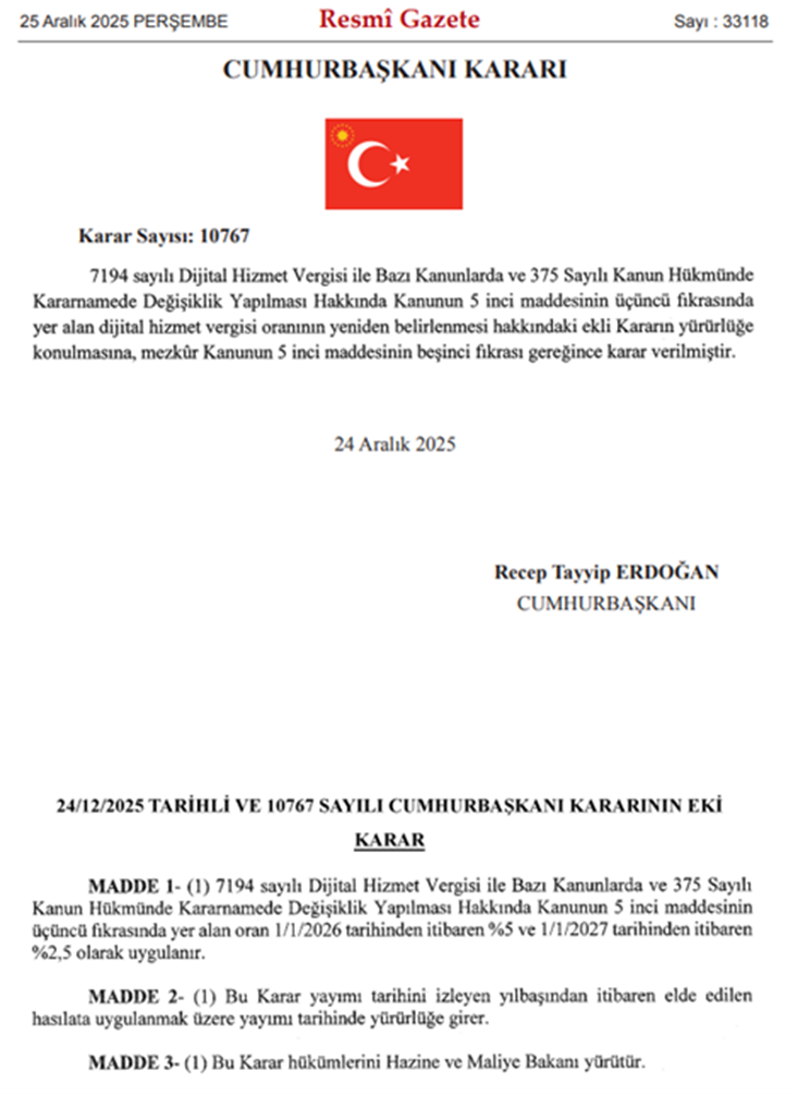 Resmi Gazete'de yayımlanan Cumhurbaşkanı kararına göre yüzde 7,5 seviyesinde olan dijital hizmet vergisi 2026 başında itibaren yüzde 5, 2027'den itibaren yüzde 2,5 oranında uygulanacak. Teknoloji şirketlerinin dijital reklamcılık, sosyal medya hizmetleri, çevrim içi aracılık ve dijital içerik satışlarından elde ettiği satışlara uygulanan dijital hizmet vergisi düşürüldü. Resmi Gazete'de yayımlanan Cumhurbaşkanı kararına göre, bu alanlardan elde edilen kazançlara 1 Ocak 2026 tarihinden itibaren uygulanacak dijital hizmet vergisi oranı yüzde 5, 1 Ocak 2027 tarihinden itibaren yüzde 2,5 olarak belirlendi. Karar Google, Meta, X, TikTok, Amazon, YouTube ve Netflix gibi küresel şirketleri yakından ilgilendiriyor. Trump kaldırılmasını istemişti ABD Başkanı Donald Trump, birçok ülkede uygulanan Dijital Hizmet Vergisi'nin kaldırılması çağrısı yapmış, aksi halde yaptırım uygulayacaklarını dile getirmişti. Bu konuda en son ağustos ayında açıklama yapan Trump, "Vergiyi kaldırmazsanız, yüksek gümrük vergileri ve teknoloji ihracatına kısıtlama gelir" demişti. Trump, açıklamasında "Dijital vergi, yasa, kural veya düzenleme uygulayan tüm ülkeleri uyarıyorum. Bu ayırımcı uygulamalar kaldırılmazsa, ABD başkanı olarak o ülkenin ABD'ye yaptığı ihracata yönelik yüksek ek gümrük vergileri getireceğim ve teknolojimiz ile çiplerimizin ihracatını kısıtlayacağım" ifadelerini kullanmıştı. Bu vergi Türkiye'de de Mart 2020 tarihinden itibaren geçerli olmak üzere, yüzde 7,5 oranı ile yürürlüğe girmişti. Kaynak: Resmi Gazete