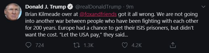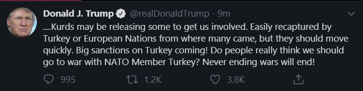 ABD Başkanı Trump twitter hesabından, "Türkiye'ye büyük yaptırımlar geliyor ama kimse savaşmamızı beklemesin" dedi. Sosyal medya hesabını sıklıkla kullanmasıyla gündeme gelen Trump, twitter hesabından flaş bir çıkış yaptı. Kürtlerin IŞİD esirlerinden bazılarını bırakarak ABD'yi müdahil etmeye çalışıyor olabileceğini söyleyen Trump şöyle devam etti: "Türkiye veya pek çoğunun geldiği yer olan Avrupa Ulusları kolaylıkla yeniden yakalar, ama çabuk hareket etmeleri lazım. Türkiye'ye büyük yaptırımlar geliyor! İnsanlar gerçekten NATO üyesi Türkiye ile savaşa girmemiz gerektiğini mi düşünüyor? Asla bitmeyen savaşlar bitecek!"