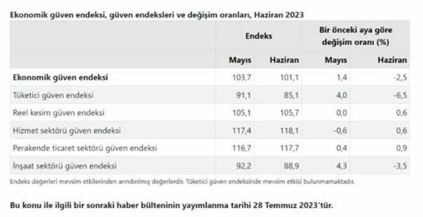 TÜİK verilerine göre, ekonomik güven endeksi haziran ayında yüzde 2,5 oranında gerileme gösterdi. Türkiye İstatistik Kurumu (TÜİK) haziran ayı ekonomik güven endeksi verilerini açıkladı. Tüketici ve üreticilerin genel ekonomik duruma ilişkin değerlendirme, beklenti ve eğilimlerini özetleyen bir bileşik endeks olan ekonomik güven endeksi mayıs ayında 103,7 iken, haziran ayında yüzde 2,5 oranında azalarak 101,1 değerini aldı. Bir önceki aya göre haziran ayında tüketici güven endeksi yüzde 6,5 oranında azalarak 85,1 değerini, reel kesim (imalat sanayi) güven endeksi yüzde 0,6 oranında artarak 105,7 değerini, hizmet sektörü güven endeksi yüzde 0,6 oranında artarak 118,1 değerini, perakende ticaret sektörü güven endeksi yüzde 0,9 oranında artarak 117,7 değerini, inşaat sektörü güven endeksi yüzde 3,5 oranında azalarak 88,9 değerini aldı. Kaynak: TÜİK