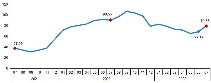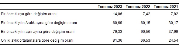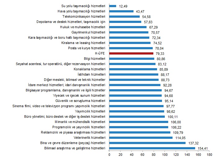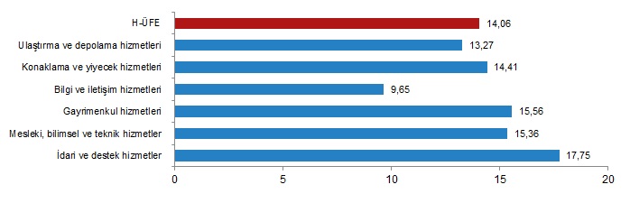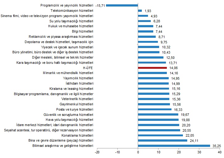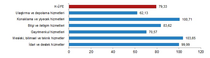 TÜİK verilerine göre, Hizmet Üretici Fiyat Endeksi hazirandaki yükseliş seyrini temmuz ayında da sürdürdü. Türkiye İstatistik Kurumu (TÜİK), temmuz ayına ilişkin Hizmet Üretici Fiyat Endeksi (H-ÜFE) raporunu yayımladı. Rapora göre H-ÜFE, yıllık bazda yüzde 79,33, aylık bazda ise yüzde 14,06 artış kaydetti. Öte yandan H-ÜFE, bir önceki yılın aralık ayına göre yüzde 60,69’luk, on iki aylık ortalamalara göre yüzde 81,36’lık artış gösterdi. Haziran ayında H-ÜFE, yıllık bazda yüzde 68,9, aylık bazda yüzde 9,57 artış göstermişti. H-ÜFE değişim oranları (%), Temmuz 2023 H-ÜFE yıllık değişim oranı (%), Temmuz 2023 Ulaştırma ve depolama hizmetleri yıllık %62,13 arttı Bir önceki yılın aynı ayına göre, ulaştırma ve depolama hizmetlerinde %62,13, konaklama ve yiyecek hizmetlerinde %100,71, bilgi ve iletişim hizmetlerinde %83,62, gayrimenkul hizmetlerinde %70,57, mesleki, bilimsel ve teknik hizmetlerde %103,65, idari ve destek hizmetlerde %99,99 artış gerçekleşti. H-ÜFE yıllık değişim oranları (%), Temmuz 2023 Ulaştırma ve depolama hizmetleri aylık %13,27 arttı Bir önceki aya göre, ulaştırma ve depolama hizmetlerinde %13,27, konaklama ve yiyecek hizmetlerinde %14,41, bilgi ve iletişim hizmetlerinde %9,65, gayrimenkul hizmetlerinde %15,56, mesleki, bilimsel ve teknik hizmetlerde %15,36, idari ve destek hizmetlerde %17,75 artış gerçekleşti. H-ÜFE aylık değişim oranları (%), Temmuz 2023 Yıllık H-ÜFE'ye göre 9 alt sektör daha düşük, 18 alt sektör daha yüksek değişim gösterdi H-ÜFE sektörlerinden su yolu taşımacılığı hizmetleri %12,49, hava yolu taşımacılığı hizmetleri %43,47, telekomünikasyon hizmetleri %54,58 ile endekslerin en az arttığı alt sektörler oldu. Buna karşılık bilimsel araştırma ve geliştirme hizmetleri %154,41, bina ve çevre düzenleme (peyzaj) hizmetleri %137,32, veterinerlik hizmetleri %114,05 ile endekslerin en fazla arttığı alt sektörler oldu. Sektörlere göre H-ÜFE yıllık değişim oranları (%), Temmuz 2023 Aylık H-ÜFE'ye göre 12 alt sektör daha düşük, 15 alt sektör daha yüksek değişim gösterdi Aylık azalış gösteren tek alt sektör %15,71 ile programcılık ve yayıncılık hizmetleri oldu. Buna karşılık bilimsel araştırma ve geliştirme hizmetleri %35,25, bina ve çevre düzenleme (peyzaj) hizmetleri %24,11, konaklama hizmetleri %22,05 ile endekslerin en fazla arttığı alt sektörler oldu. Sektörlere göre H-ÜFE aylık değişim oranları (%), Temmuz 2023 Bu konu ile ilgili bir sonraki haber bülteni yayımlanma tarihi 29 Eylül 2023'tür.