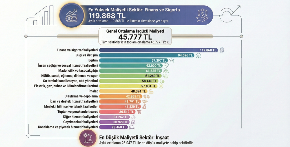 TÜİK, sektörlerin işgücü maliyetlerini gösteren 2024 verilerini açıkladı. İlgili verilere göre işgücü maliyetinin en yüksek olduğu sektör finans ve sigorta olurken, en düşük olduğu sektör inşaat oldu. TÜİK, 2024 yılına ilişkin işgücü maliyeti istatistiklerini açıkladı. İşgücü Maliyeti İstatistikleri sonuçlarına göre 2024 yılında aylık ortalama işgücü maliyeti 45 bin 777 TL olarak hesaplandı. İşgücü maliyeti en yüksek sektör finans ve sigorta İşgücü maliyetlerine sektör bazlı bakıldığında zirvede finans ve sigorta sektörü yer aldı Buna göre finans ve sigorta faaliyetleri 119 bin 868 TL ile aylık ortalama işgücü maliyetinin en yüksek olduğu sektör oldu. Bu sektörü, 94 bin 96 TL ile bilgi ve iletişim ve 67 bin 397 TL ile eğitim sektörü izledi. İnşaat sektörü ise 26 bin 47 TL ile aylık ortalama işgücü maliyetinin en düşük olduğu sektör oldu. Bu sektörü de 29 bin 460 TL ile konaklama ve yiyecek hizmeti faaliyetleri ve 30 bin 929 TL ile gayrimenkul faaliyetleri sektörleri takip etti. Sosyal güvenlik payı yüzde 13,9 İşgücü maliyeti içinde brüt kazancın payı yüzde 85,7, sosyal güvenlik ödemelerinin payı yüzde 13,9 ve diğer işgücü maliyeti ödemelerinin payı yüzde 0,4 olarak gerçekleşti. Çalışılan süreler için yapılan düzenli ödemeler yüzde 78,4'lük oranla kazanç bileşenleri içinde en büyük paya sahip oldu. Çalışılan süreler için yapılan düzensiz ödemelerin payı yüzde 9,9 olarak gerçekleşirken çalışılmayan süreler için yapılan ödemelerin payı yüzde 8,6 oldu. Ayni ödemelerin kazanç içindeki payı yüzde 2,7 olarak gerçekleşti. Tasarruf sandıklarına yapılan ödemelerin payı ise yüzde 0,4 oldu. Sosyal güvenlik ödemeleri içinde en büyük payı yüzde 84,3 oranıyla zorunlu sosyal güvenlik ödemeleri alırken, gönüllü sosyal güvenlik ödemelerinin oranı yüzde 0,7 olarak gerçekleşti. Kıdem ve ihbar tazminatı ödemelerinin oranı ise yüzde 15,0 olarak gerçekleşti. [news_id:796463]