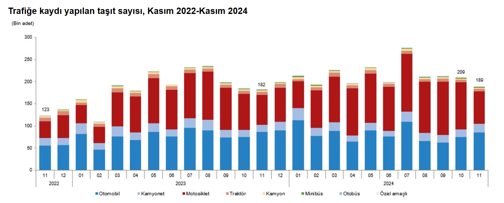 Kasım ayında trafiğe 188 bin 966 aracın kaydı yapılırken 4 bin 444 aracın da kaydı silindi. Böylelikle trafiğe kayıtlı toplam taşıt sayısı kasım ayı sonu itibarıyla 31 milyon 67 bin 698 oldu. Türkiye İstatistik Kurumu (TÜİK), kasım ayına ilişkin motorlu kara taşıtları istatistiklerini açıkladı. Buna göre, kasım ayında trafiğe kaydı yapılan taşıtların yüzde 44,9'unu otomobil, yüzde 38,9'unu motosiklet, yüzde 10,3'ünü kamyonet, yüzde 3,1'ini traktör, yüzde 1,5'ini kamyon, yüzde 0,8'ini minibüs, yüzde 0,4'ünü otobüs ve yüzde 0,1'ini özel amaçlı taşıtlar oluşturdu. Trafiğe kaydı yapılan taşıt sayısı bir önceki aya göre özel amaçlı taşıtta yüzde 51,8, kamyonette yüzde 14,1, otomobilde yüzde 13,7, minibüste yüzde 5,8, traktörde yüzde 0,5 artarken motosiklette yüzde 31,1, otobüste yüzde 5,5 ve kamyonda yüzde 1,1 azaldı. Kaynak: TÜİK Kasım ayında geçen yılın aynı ayına göre trafiğe kaydı yapılan taşıt sayısı minibüste yüzde 47,3, özel amaçlı taşıtta yüzde 35,8, kamyonette yüzde 18,7, motosiklette yüzde 8,9 artarken traktörde yüzde 17,5, kamyonda yüzde 17,1, otobüste yüzde 8,1 ve otomobilde yüzde 1,3 azaldı. Toplam taşıt sayısı 31 milyon 67 bin 698 Kasım ayı sonu itibarıyla trafiğe kayıtlı taşıtların yüzde 51,9'unu otomobil, yüzde 19,8'ini motosiklet, yüzde 15,1'ini kamyonet, yüzde 7,3'ünü traktör, yüzde 3,2'sini kamyon, yüzde 1,7'sini minibüs, yüzde 0,7'sini otobüs ve yüzde 0,3'ünü özel amaçlı taşıtlar oluşturdu. Devri yapılan taşıtların yüzde 68,7'sini otomobil, yüzde 15,4'ünü kamyonet, yüzde 8,2'sini motosiklet, yüzde 3,2'sini traktör, yüzde 2,1'ini kamyon, yüzde 1,7'sini minibüs, yüzde 0,5'ini otobüs ve yüzde 0,2'sini özel amaçlı taşıtlar oluşturdu. Trafiğe kaydı yapılan otomobillerin yüzde 13,3'ü Renault, yüzde 8,3'ü Volkswagen, yüzde 7,4'ü Hyundai, yüzde 7,1'i Fiat, yüzde 5,3'ü Peugeot, yüzde 5,2'si Skoda, yüzde 5,1'i Toyota, yüzde 4,6'sı Opel, yüzde 4,1'i BMW, yüzde 3,9'u Mercedes-Benz, yüzde 3,3'ü Citroen, yüzde 3,0'ı Nissan, yüzde 2,8'i Seat, yüzde 2,5'i Kia, yüzde 2,3'ü Dacia, yüzde 2,3'ü Audi, yüzde 2,2'si Ford, yüzde 2,1'i Chery, yüzde 1,5'i Honda, yüzde 1,3'ü Cupra ve yüzde 12,5'i diğer markalardan oluştu. [news_id:755704]