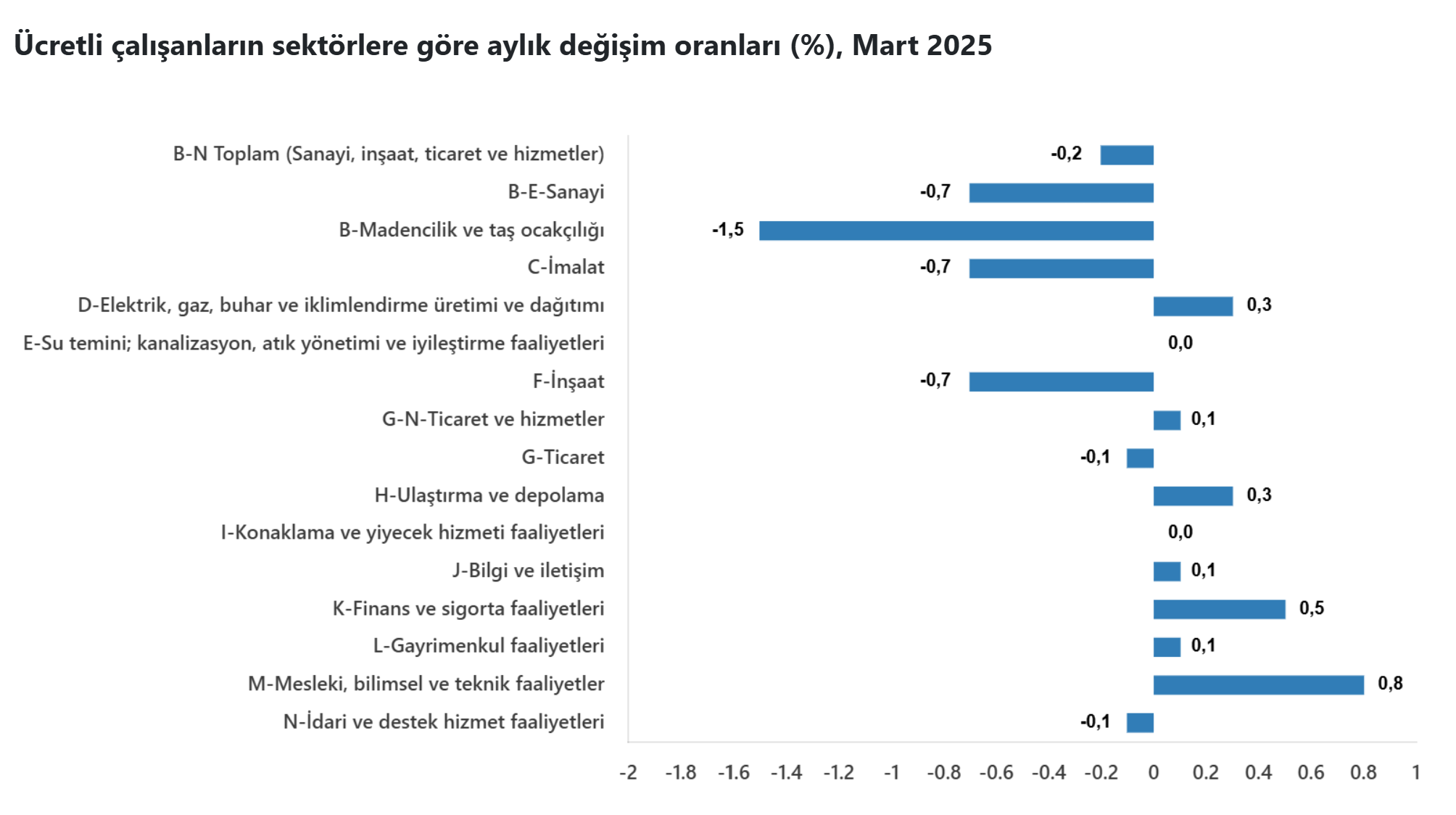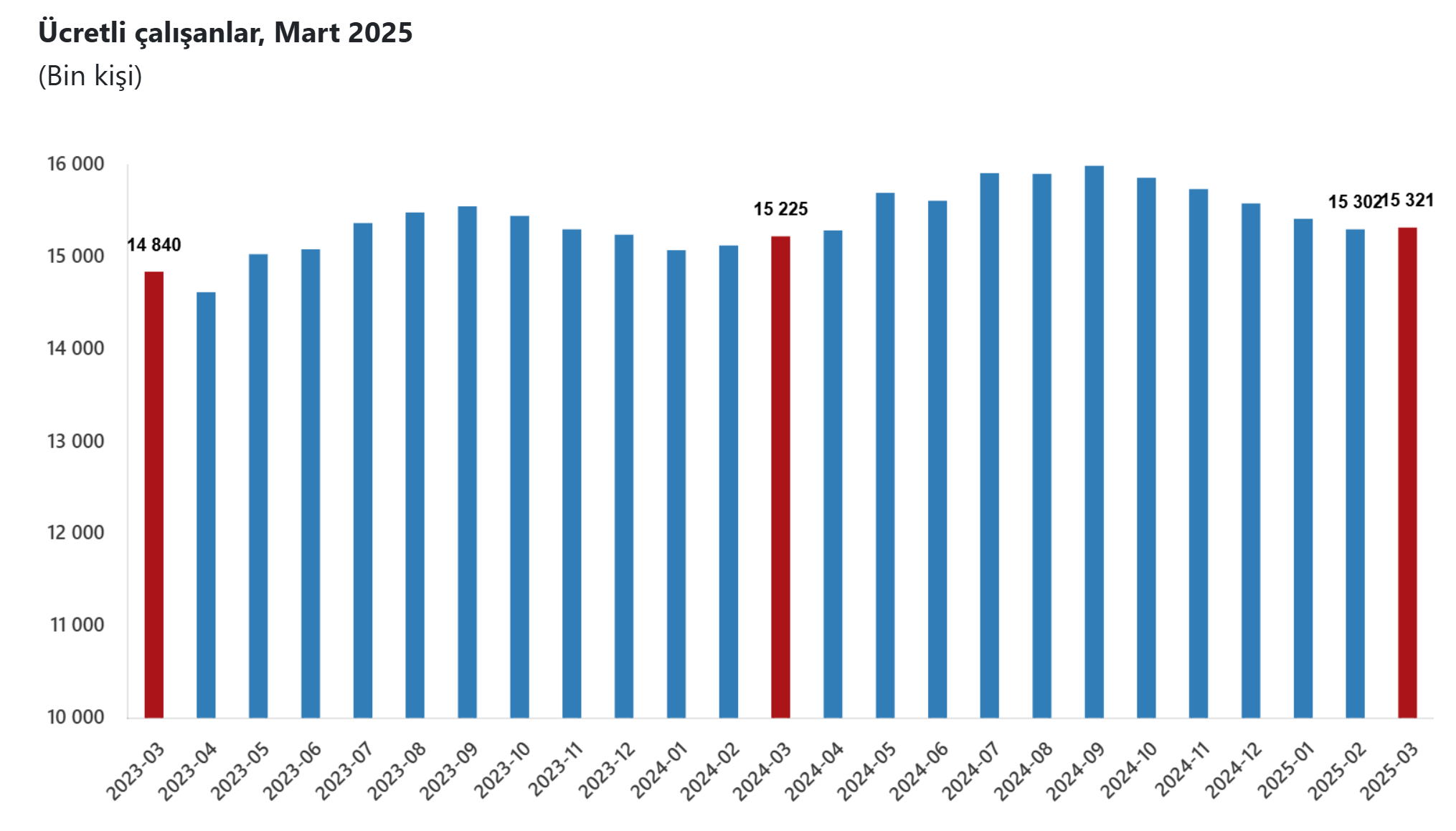 Sanayi, inşaat ve ticaret-hizmet sektörleri toplamında ücretli çalışan sayısı, mart ayında bir önceki yılın aynı ayına göre yüzde 0,6 artarak 15 milyon 320 bin 987 oldu. Türkiye İstatistik Kurumu (TÜİK), Mart 2025 dönemine ilişkin ücretli çalışan istatistiklerini yayımladı. Sanayi, inşaat ve ticaret-hizmet sektörleri toplamında ücretli çalışan sayısı 2025 Mart ayında bir önceki yılın aynı ayına göre %0,6 arttı. Ücretli çalışan sayısı bir önceki yılın aynı ayında 15 milyon 224 bin 973 kişi iken, 2025 yılı Mart ayında 15 milyon 320 bin 987 kişi oldu. Ücretli çalışanların alt detaylarına bakıldığında; 2025 Mart ayında ücretli çalışan sayısı yıllık olarak sanayi sektöründe %2,6 azaldı, inşaat sektöründe aynı kaldı ve ticaret-hizmet sektöründe %2,7 arttı. Kaynak: TÜİK Ücretli çalışan sayısı aylık %0,2 azaldı Sanayi, inşaat ve ticaret-hizmet sektörleri toplamında ücretli çalışan sayısı 2025 Mart ayında bir önceki aya göre %0,2 azaldı. Ücretli çalışanların alt detaylarına bakıldığında; 2025 Mart ayında ücretli çalışanlar aylık olarak sanayi sektöründe %0,7 azaldı, inşaat sektöründe %0,7 azaldı ve ticaret-hizmet sektöründe %0,1 arttı. Kaynak: TÜİK