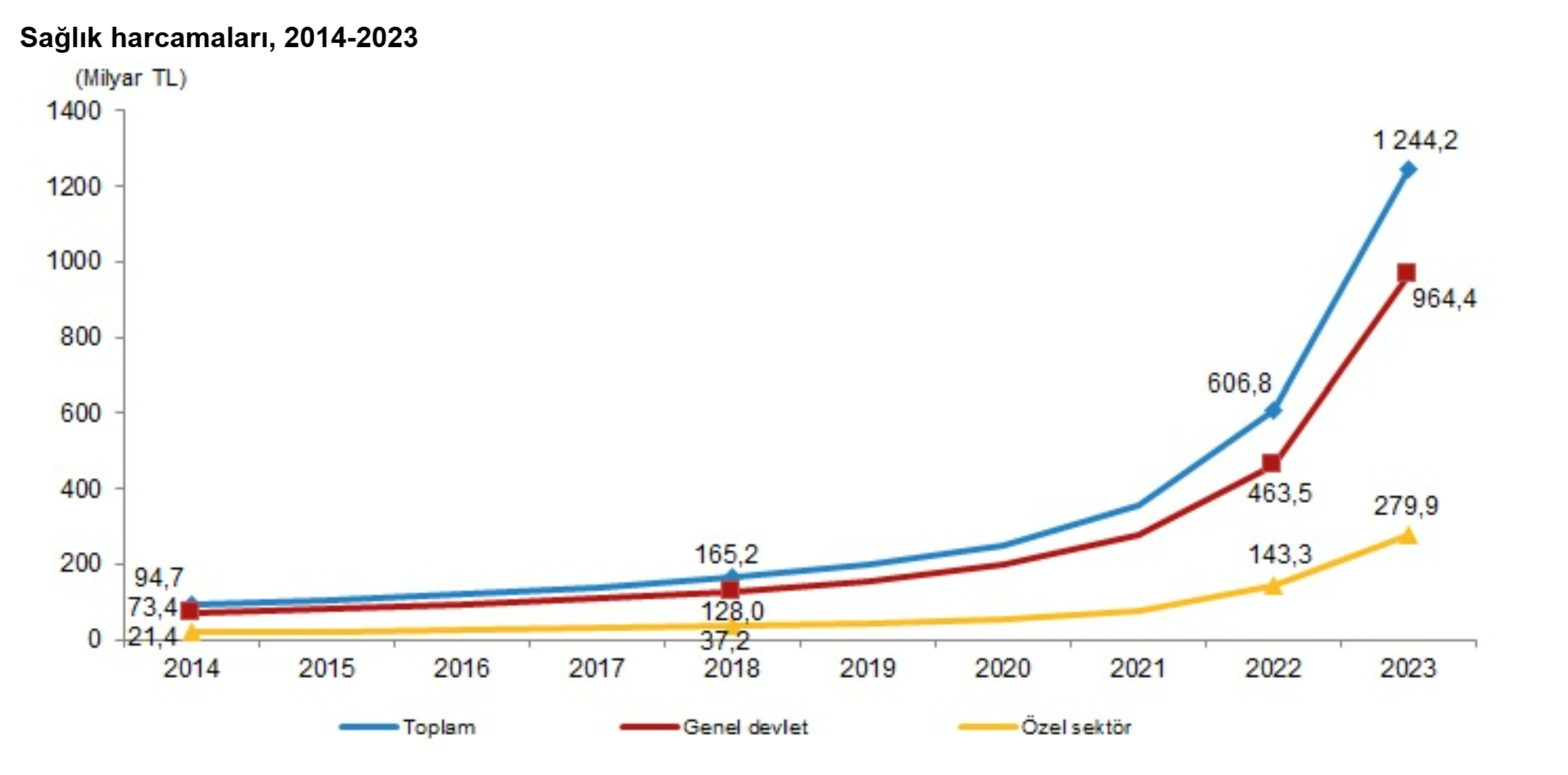 TÜİK verilerine göre, ülkemizde toplam sağlık harcaması geçen yıl yüzde 105 artarak 1 trilyon 244 milyar 237 milyon TL oldu. Türkiye İstatistik Kurumu, 2023 yılına ilişkin sağlık harcamaları istatistiklerini yayımladı. Buna göre toplam sağlık harcaması 2023 yılında bir önceki yıla göre %105,0 artarak 1 trilyon 244 milyar 237 milyon TL'ye yükseldi. Genel devlet sağlık harcaması %108,1 artarak 964 milyar 355 milyon TL'ye ulaştı. Özel sektör sağlık harcaması ise %95,3'lük bir artış oranı ile 279 milyar 883 milyon TL olarak tahmin edildi. Kaynak: TÜİK Toplam sağlık harcamasının %77,5'i genel devlet bütçesinden karşılandı Genel devlet sağlık harcamasının toplam sağlık harcamasına oranı 2023 yılında %77,5, özel sektör sağlık harcamasının oranı ise %22,5 olarak gerçekleşti. Genel devlet ve özel sektörün alt bileşenlerine bakıldığında, 2023 yılında Sosyal Güvenlik Kurumu %42,1, merkezi devlet %34,8, hanehalkları %17,8, sigorta şirketleri %2,5, hanehalklarına hizmet eden kar amacı gütmeyen kuruluşlar ile diğer işletmeler %2,2, mahalli idareler %0,6'lık bir paya sahip oldu. [news_id:755148]