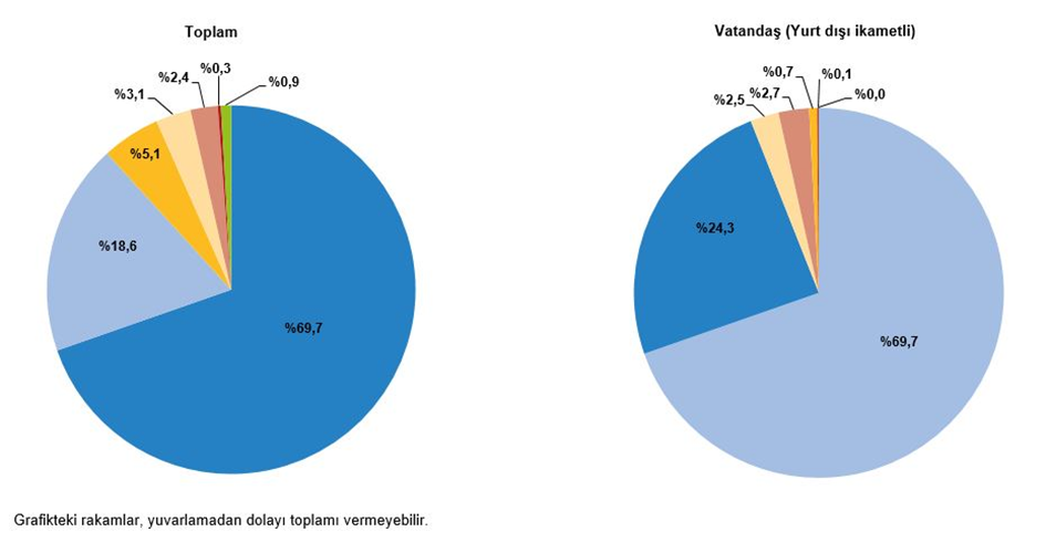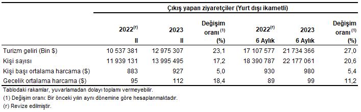 TÜİK verilerine göre, ikinci çeyrekte turizm gelirleri bir önceki yılın aynı çeyreğine göre %23,1 artarak 12 milyar 975 milyon 307 bin dolar oldu. Turizm gelirinin %14,5'i ülkemizi ziyaret eden yurt dışı ikametli vatandaşlardan elde edildi. TÜİK, Turizm İstatistikleri, II. Çeyrek: Nisan - Haziran, 2023 sonuçlarını yayımladı. Buna göre, bu çeyrekte yapılan harcamaların 9 milyar 714 milyon 687 bin dolarını kişisel harcamalar, 3 milyar 260 milyon 620 bin dolarını ise paket tur harcamaları oluşturdu. Ziyaretçi sayısı geçen yılın aynı çeyreğine göre %17,2 arttı Ülkemizden çıkış yapan ziyaretçi sayısı 2023 yılı II. çeyreğinde bir önceki yılın aynı çeyreğine göre %17,2 artarak 13 milyon 995 bin 495 kişi oldu. Ziyaretçilerin %12'sini 1 milyon 676 bin 147 kişi ile yurt dışında ikamet eden vatandaşlar oluşturdu. Bu çeyrekte ülkemizden çıkış yapan ziyaretçilerin gecelik ortalama harcaması 112 dolar oldu. Yurt dışında ikamet eden vatandaşların gecelik ortalama harcaması ise 83 dolar oldu. Turizm geliri ve ziyaretçi sayısı, II. Çeyrek: Nisan-Haziran, 2023 Bu çeyrekte geçen yılın aynı çeyreğine göre spor, eğitim, kültür harcaması %158,2, yeme-içme harcamaları %45,4, uluslararası ulaştırma harcamaları %38,6 arttı. En çok gezi amacıyla ziyaret gerçekleşti Bu çeyrekte ziyaretçiler ülkemizi %69,7 ile en çok "gezi, eğlence, sportif ve kültürel faaliyetler" amacıyla ziyaret etti İkinci sırada %18,6 ile "akraba ve arkadaş ziyareti", üçüncü sırada ise %5,1 ile "alışveriş" yer aldı. Yurt dışı ikametli vatandaşlar ise ülkemize %69,7 ile en çok "akraba ve arkadaş ziyareti" amacıyla geldi. Geliş amaçlarına göre ziyaretçiler, II. Çeyrek, 2023 Turizm gideri geçen yılın aynı çeyreğine göre %67 arttı Yurt içinde ikamet edip başka ülkeleri ziyaret eden vatandaşlarımızın harcamalarından oluşan turizm gideri, geçen yılın aynı çeyreğine göre %67 artarak 1 milyar 766 milyon 639 bin dolar oldu. Bunun 1 milyar 611 milyon 638 bin dolarını kişisel, 155 milyon dolarını ise paket tur harcamaları oluşturdu. Yurt dışını ziyaret eden vatandaşlar 2022 yılı II. çeyreğine göre %72,7 arttı Bu çeyrekte yurt dışını ziyaret eden vatandaş sayısı bir önceki yılın aynı çeyreğine göre %72,7 artarak 2 milyon 877 bin 450 kişi oldu. Bunların kişi başı ortalama harcaması 614 dolar olarak gerçekleşti. Kişi başı ortalama harcama, II. Çeyrek, 2023 Bu konu ile ilgili bir sonraki haber bülteninin yayımlanma tarihi 31 Ekim 2023'tür.