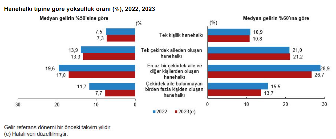 TÜİK’in açıkladığı Yoksulluk ve Yaşam Koşulları İstatistikleri verilerine göre, 2023 yılında göreli yoksulluk oranı yüzde 13,5 oldu. Türkiye İstatistik Kurumu (TÜİK) "Yoksulluk ve Yaşam Koşulları İstatistikleri" verilerini açıkladı. Toplumun genel düzeyine göre belirli bir sınırın altında gelire sahip olan bireyler göreli anlamda yoksul sayılmaktadır. Eşdeğer hanehalkı kullanılabilir fert medyan gelirinin yüzde 50'si dikkate alınarak belirlenen yoksulluk sınırına göre, yoksulluk oranı 2023 yılında 0,9 puan azalarak yüzde 13,5 oldu. Medyan gelirin yüzde 60'ı dikkate alınarak belirlenen yoksulluk sınırına göre hesaplanan yoksulluk oranı ise son yılda 0,3 puan azalarak yüzde 21,3 olarak gerçekleşti. Türkiye İstatistik Kurumu (TÜİK) tarafından yapılan açıklamaya göre, eşdeğer hanehalkı kullanılabilir fert medyan gelirinin yüzde 40'ı dikkate alınarak belirlenen yoksulluk sınırına göre, yoksulluk oranı bir önceki yıla göre 0,6 puanlık azalış ile yüzde 7,0 olarak gerçekleşti. Medyan gelirin yüzde 70'i dikkate alınarak belirlenen yoksulluk sınırına göre hesaplanan yoksulluk oranı ise bir önceki yıla göre 0,3 puanlık azalış ile yüzde 29,0 oldu. En düşük yoksulluk oranı çekirdek aile bulunmayan birden fazla kişiden oluşanlar hanelerde Hanehalkı tipine göre eşdeğer hanehalkı kullanılabilir fert medyan gelirinin yüzde 50'si dikkate alınarak hesaplanan yoksulluk oranlarına bakıldığında; çekirdek aile bulunmayan birden fazla kişiden oluşan hanehalklarında yoksulluk oranı bir önceki yıla göre 4 puan azalarak yüzde 7,7, tek kişilik hanehalklarında ise 0,2 puan azalarak yüzde 7,3 olmuştur. En az bir çekirdek aile ve diğer kişilerden oluşan hanehalklarının yoksulluk oranı 2,6 puan azalarak yüzde 17,0, tek çekirdek aileden oluşan hanehalklarının yoksulluk oranı ise 0,6 puan azalarak yüzde 13,3 oldu. Kaynak: TÜİK Okur-yazar olmayanların yüzde 25,4'ü yükseköğretim mezunlarının ise yüzde 2,7'si yoksul Eşdeğer hanehalkı kullanılabilir fert medyan gelirinin yüzde 50'si dikkate alınarak hesaplanan yoksulluk oranına göre; okur-yazar olmayan fertlerin yüzde 25,4'ü, bir okul bitirmeyenlerin yüzde 23,6'sı, lise altı eğitimlilerin yüzde 13,6'sı, lise ve dengi okul mezunlarının ise yüzde 7,2'si yoksul olarak hesaplandı. Yükseköğretim mezunları ise yüzde 2,7 ile en düşük yoksulluk oranına sahip grup oldu. Maddi ve sosyal yoksunluk oranı yüzde 14,4 oldu Maddi ve sosyal yoksunluk oranı hesabında hane düzeyinde sorgulanan değişkenler; otomobil sahipliği, ekonomik olarak beklenmedik harcamaları yapabilme, evden uzakta bir haftalık tatil masrafını karşılayabilme, kira, konut kredisi ve faizli borçları ödeyebilme, iki günde bir et, tavuk, balık içeren yemek yiyebilme, evin ısınma ihtiyacını karşılayabilme ve mobilyaları eskidiğinde değiştirebilme durumudur. Bu oran için fert düzeyinde toplanan değişkenler ise; eskimiş giysileri yerine yenisini alabilme, düzgün iki çift ayakkabıya sahip olabilme, ayda en az bir kez tanıdıkları ile toplanabilme, ücretli boş zaman faaliyetlerine katılabilme, kendini iyi hissetmek için bir miktar para harcayabilme ve kişisel amaçlı kullanım için internet sahipliği olarak belirlenmiştir. Yukarıda belirtilen on üç maddenin en az yedisini karşılayamayanların oranı olarak tanımlanan maddi ve sosyal yoksunluk oranı; 2022 yılında %16,6 iken 2023 yılı anket sonuçlarında 2,2 puan azalarak %14,4 olarak tahmin edildi. Kaynak: TÜİK Sürekli yoksulluk oranı yüzde 13,0 oldu Dört yıllık panel veri kullanılarak hesaplanan sürekli yoksulluk oranı, eşdeğer hanehalkı kullanılabilir fert medyan gelirinin yüzde 60'ına göre son yılda ve aynı zamanda önceki üç yıldan en az ikisinde de yoksul olan fertleri kapsamaktadır. Buna göre, 2023 yılı anket sonuçlarına göre sürekli yoksulluk oranı bir önceki yıla göre 1 puan azalarak yüzde 13,0 oldu. Göreli yoksulluk oranı en düşük Gaziantep, Adıyaman, Kilis bölgesinde gerçekleşti Ülkemizde yaşanan deprem nedeni ile 2023 yılında TR63 (Hatay, Kahramanmaraş, Osmaniye) bölgesinde alan çalışması yapılamadığı için İstatistiki Bölge Birimleri Sınıflandırması (İBBS) ayrımında verilen bölgesel sonuçlar 25 bölgeyi kapsamaktadır. İBBS 2. Düzey bölgelerinin her biri için eşdeğer hanehalkı kullanılabilir fert medyan gelirinin yüzde 50'sine göre hesaplanan yoksulluk sınırına göre, gelire dayalı göreli yoksulluk oranının en yüksek olduğu bölgeler; yüzde 14,6 ile TRA2 (Ağrı, Kars, Iğdır, Ardahan) ve TR82 (Kastamonu, Çankırı, Sinop) yüzde 13,9 ile TR61 (Antalya, Isparta, Burdur) oldu. Göreli yoksulluk oranı en düşük olan İBBS 2. Düzey bölgeleri ise yüzde 3,1 ile TRC1 (Gaziantep, Adıyaman, Kilis), yüzde 6,7 ile TRC3 (Mardin, Batman, Şırnak, Siirt) ve TRC2 (Şanlıurfa, Diyarbakır) oldu. Yoksulluk veya sosyal dışlanma riski altında olanların oranı yüzde 30,7 oldu Yoksulluk veya sosyal dışlanma riski altında olanlar; göreli yoksulluk, maddi ve sosyal yoksunluk ve düşük iş yoğunluğu göstergelerinin en az birinden yoksun olanları ifade etmektedir. Son yıl sonuçlarına göre fertlerin yüzde 30,7'si yoksulluk veya sosyal dışlanma riski altında kaldı. Bu oran yaş gruplarına göre incelendiğinde; 0-17 yaş grubunda yüzde 40,1, 18-64 yaş grubunda yüzde 28,0, 65 ve üstü yaş grubunda ise yüzde 23,1 olarak tahmin edildi. Kendilerine ait bir konutta yaşayanların oranı yüzde 56,2 oldu Oturulan konuta sahip olanların oranı geçen yıla göre 0,5 puan azalarak 2023 yılında yüzde 56,2 olarak hesaplanırken, kirada oturanların oranı yüzde 27,8, lojmanda oturanların oranı yüzde 0,9, kendi konutunda oturmayıp kira ödemeyenlerin oranı ise yüzde 15,1 oldu. Konutun izolasyonundan dolayı ı