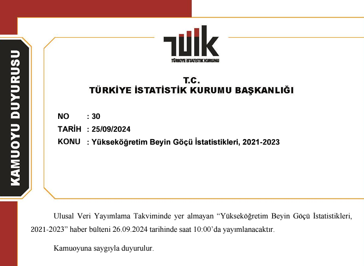 Türkiye İstatistik Kurumu (TÜİK), "Yükseköğretim Beyin Göçü İstatistikleri 2021-2023" haber bültenini yarın saat 10.00'da kamuoyuyla paylaşacağını bildirdi. TÜİK'ten konuya ilişkin yazılı açıklama yapıldı. Açıklamada, "Ulusal Veri Yayımlama Takviminde yer almayan Yükseköğretim Beyin Göçü İstatistikleri, 2021-2023 haber bülteni 26 Eylül tarihinde saat 10.00'da yayımlanacaktır." ifadesi kullanıldı. Kaynak: TÜİK