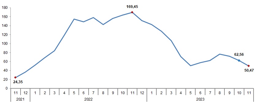 Tarım Ürünleri Üretici Fiyat Endeksi (Tarım ÜFE) kasımda bir önceki aya göre yüzde 0,95 azalırken geçen yılın aynı ayına kıyasla yüzde 50,47 artış gösterdi. Türkiye İstatistik Kurumu, kasım ayına ilişkin Tarım ÜFE verilerini açıkladı. Buna göre, söz konusu endeks kasımda bir önceki aya kıyasla yüzde 0,95 azalırken, geçen yılın aralık ayına göre yüzde 43,56, geçen yılın aynı ayına kıyasla yüzde 50,47 ve 12 aylık ortalamalara göre yüzde 77,98 arttı. Kaynak: TÜİK Sektörlerde bir önceki aya göre değişime bakıldığında, tarım ve avcılık ürünleri ve ilgili hizmetlerde yüzde 0,72, ormancılık ürünleri ve ilgili hizmetlerde yüzde 1,18, balık ve diğer balıkçılık ürünlerinde yüzde 10 azalış kaydedildi. Ana gruplarda bir önceki aya göre tek yıllık bitkisel ürünlerde yüzde 0,49 ve çok yıllık bitkisel ürünlerde yüzde 6,79 azalış gerçekleşirken, canlı hayvanlar ve hayvansal ürünlerde yüzde 2,92 artış görüldü. Yıllık Tarım ÜFE'ye göre 4 alt grup daha düşük, 10 alt grup daha yüksek değişim gösterdi. Yıllık artışın düşük olduğu alt gruplar yüzde 22,78 ile tahıllar (pirinç hariç), baklagiller ve yağlı tohumlar ve yüzde 26,57 ile lifli bitkiler oldu. Yıllık artışın yüksek olduğu alt gruplar ise yüzde 176 ile yağlı meyveler ve yüzde 141,58 ile üzüm olarak kayıtlara geçti. Geçen yılın aynı ayına göre azalış gösteren tek alt grubun ise yüzde 27,59 ile turunçgiller olduğu hesaplandı. Kaynak: TÜİK Aylık Tarım ÜFE'ye göre 3 alt grup daha düşük, 11 alt grup daha yüksek değişim gösterdi. Bir önceki aya göre azalışın yüksek olduğu alt gruplar yüzde 17,92 ile tropikal ve subtropikal meyveler ve yüzde 3,05 ile çeltik oldu. Aylık artışı yüksek alt grupların ise yüzde 11,32 ile yağlı meyveler ve yüzde 4,35 ile yumuşak çekirdekli meyveler ve sert çekirdekli meyveler olduğu görüldü. Endekste kapsanan 90 maddeden 40'ının ortalama fiyatında azalış, 46'sının ortalama fiyatında artış gerçekleşti.