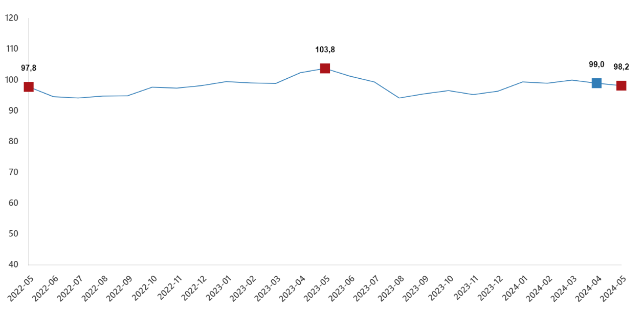 TÜİK'e göre ekonomik güven endeksi mayıs ayında yüzde 0,8 oranında azalarak 98,2 değerini aldı. Türkiye İstatistik Kurumu 2024 Mayıs ayına ilişkin Ekonomik Güven Endeksini açıkladı. Ekonomik güven endeksi nisan ayında 99 iken, mayıs ayında yüzde 0,8 oranında azalarak 98,2 değerini aldı. Kaynak: TÜİK Güven endeksleri değişim oranları Bir önceki aya göre mayıs ayında tüketici güven endeksi yüzde 0,1 oranında artarak 80,51 değerini, reel kesim (imalat sanayi) güven endeksi yüzde 1,1 oranında azalarak 102,4 değerini aldı. Aynı dönemde hizmet sektörü güven endeksi aynı düzeyde kalarak 117,1 değerini, perakende ticaret sektörü güven endeksi yüzde 3,3 oranında azalarak 111,7 değerini, inşaat sektörü güven endeksi yüzde 0,3 oranında azalarak 88,3 değerini aldı.
