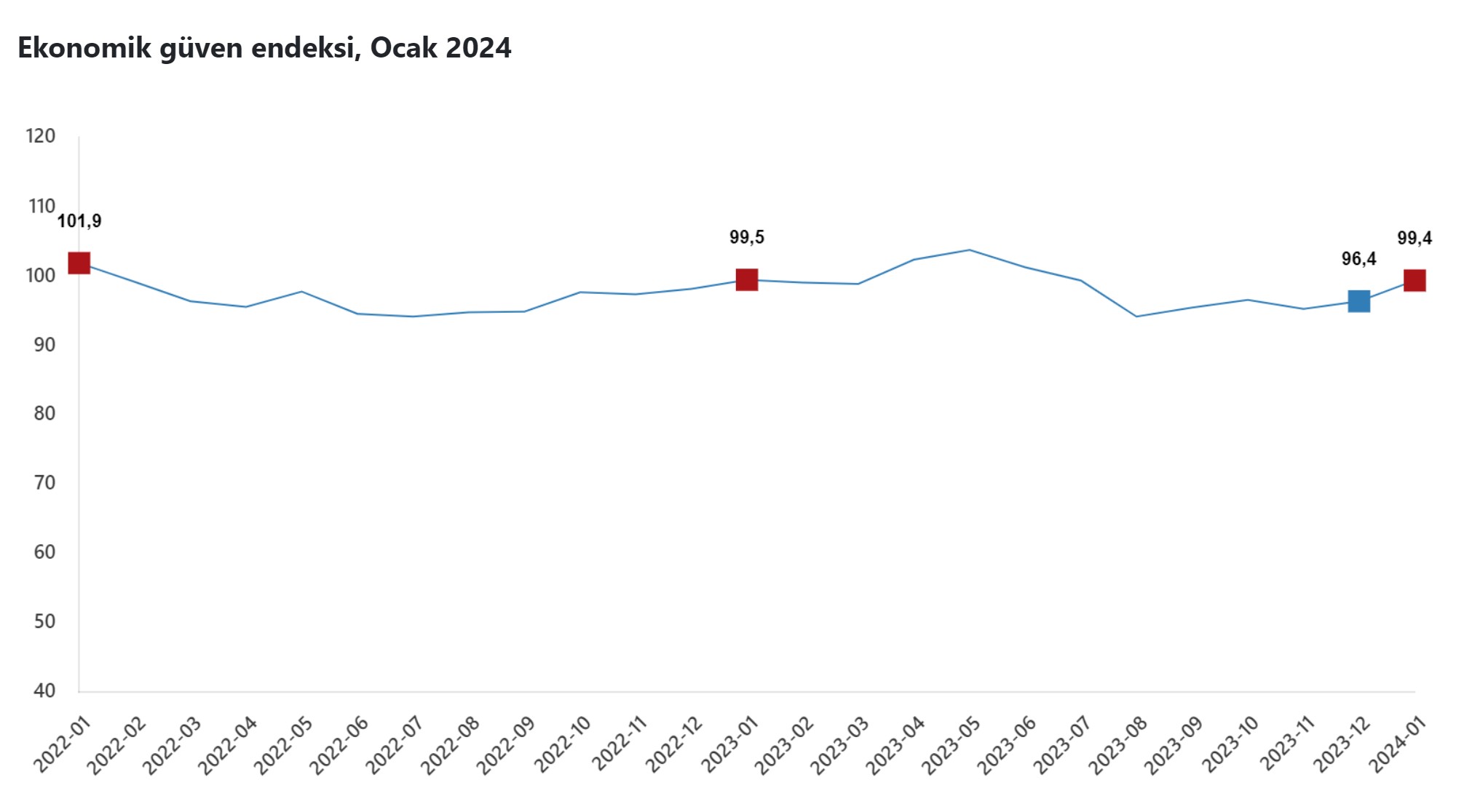 TÜİK verilerine göre ekonomik güven endeksi ocak ayında yüzde 3,1 oranında artarak 99,4 değerini aldı. Türkiye İstatistik Kurumu 2024 Ocak ayına ilişkin Ekonomik Güven Endeksini açıkladı. Ekonomik güven endeksi 2023 Aralık ayında 96,4 iken, 2024 Ocak ayında yüzde 3,1 oranında artarak 99,4 değerini aldı. Kaynak: TÜİK Ekonomik Güven Endeksi nedir? Ekonomik güven endeksi, tüketici ve üreticilerin genel ekonomik duruma ilişkin değerlendirme, beklenti ve eğilimlerini özetleyen bir bileşik endekstir. Endeks, tüketici güven endeksi, mevsim etkilerinden arındırılmış reel kesim, hizmet, perakende ticaret ve inşaat sektörleri güven endekslerinin alt endekslerinin ağırlıklandırılarak birleştirilmesinden oluşmaktadır. Ekonomik güven endeksi hesaplamasında, her bir sektörün ağırlığı o sektörün normalleştirilmiş alt endekslerine eşit dağıtılarak uygulanmakta, güven endekslerine doğrudan uygulanmamaktadır. Bu kapsamda tüketici, reel kesim, hizmet, perakende ticaret ve inşaat sektörlerine ait toplam 20 alt endeks hesaplamada kullanılmaktadır. Ekonomik güven endeksinin hesaplamasında kullanılan alt endeksler her ayın ilk iki haftasında derlenen veriler kullanılarak hesaplanmaktadır. Ekonomik güven endeksinin 100'den büyük olması genel ekonomik duruma ilişkin iyimserliği, 100'den küçük olması ise genel ekonomik duruma ilişkin kötümserliği göstermektedir.