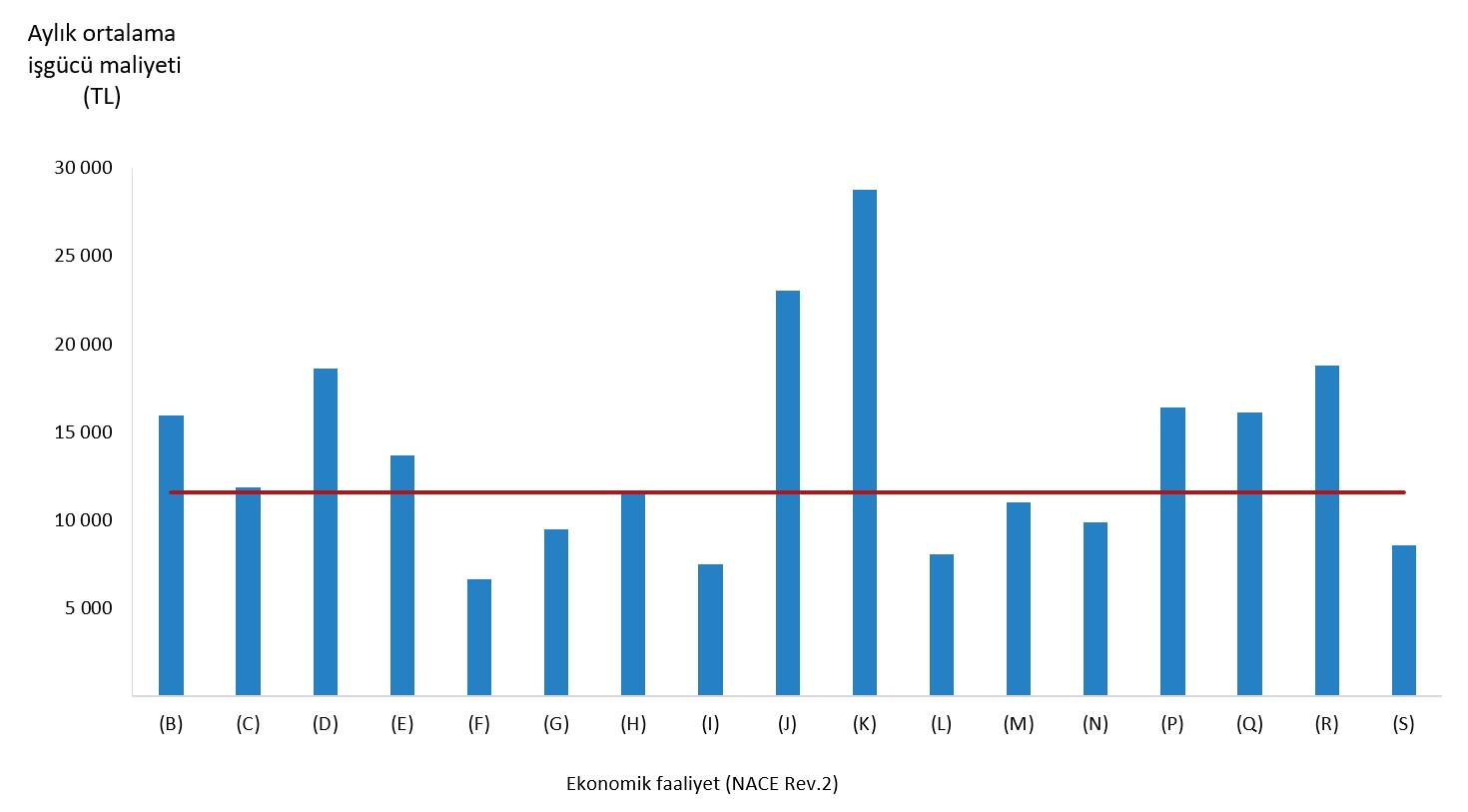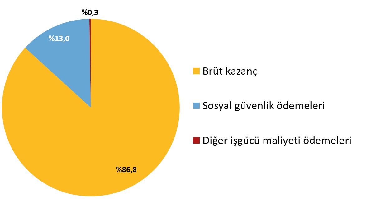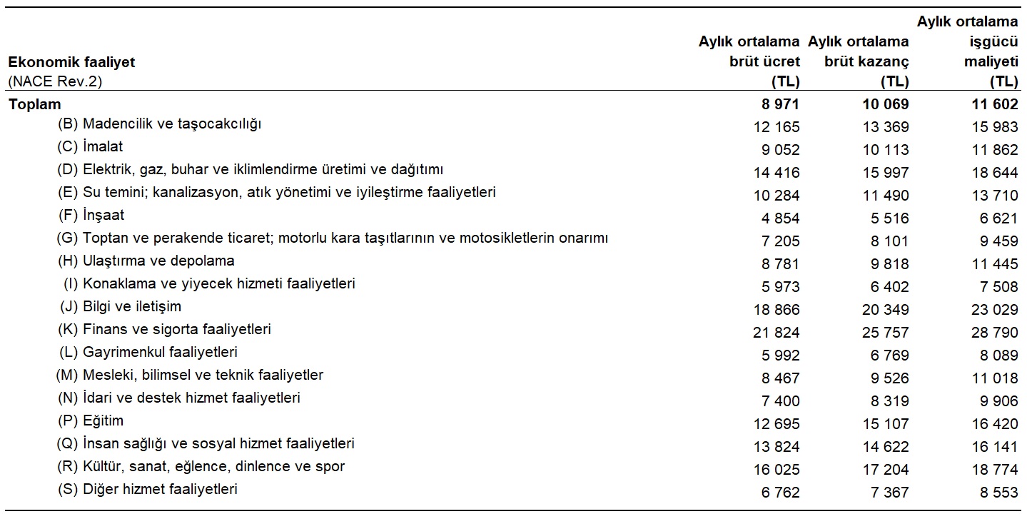 TÜİK'in İşgücü Maliyeti İstatistikleri sonuçlarına göre 2022 yılında en fazla kazandıran sektör finans ve sigorta faaliyetleri sektörü oldu. Türkiye İstatistik Kurumu (TÜİK) 2022 yılına ait İşgücü Maliyeti İstatistikleri'ni açıkladı. Buna göre, 2022 yılında aylık ortalama işgücü maliyeti 11 bin 602 TL olarak gerçekleşti. Finans ve sigorta faaliyetleri (K) sektörü, 28 790 TL ile aylık ortalama işgücü maliyetinin en yüksek olduğu sektör oldu. Bu sektörü, 23 029 TL ile bilgi ve iletişim (J) ve 18 774 TL ile kültür, sanat, eğlence, dinlence ve spor (R) sektörleri izledi. İnşaat (F) sektörü ise 6 621 TL ile aylık ortalama işgücü maliyetinin en düşük olduğu sektör oldu. Bu sektörü 7 508 TL ile konaklama ve yiyecek hizmeti faaliyetleri (I) ve 8 089 TL ile gayrimenkul faaliyetleri (L) sektörleri takip etti. Ekonomik faaliyete göre aylık ortalama işgücü maliyeti, 2022 Kaynak: TÜİK Ekonomik faaliyete göre aylık ortalama brüt ücret, brüt kazanç ve işgücü maliyeti, 2022 Kaynak: TÜİK İşgücü maliyeti bileşenleri içinde brüt kazancın payı %86,8 oldu İşgücü maliyeti içinde brüt kazancın payı %86,8, sosyal güvenlik ödemelerinin payı %13,0 ve diğer işgücü maliyeti ödemelerinin payı %0,3 olarak gerçekleşti. İşgücü maliyeti bileşenleri, 2022 Kaynak: TÜİK Çalışılan süreler için yapılan düzenli ödemelerin kazanç içindeki payı %79,3 oldu Çalışılan süreler için yapılan düzenli ödemeler %79,3'lük oranla kazanç bileşenleri içinde en büyük paya sahip oldu. Çalışılan süreler için yapılan düzensiz ödemelerin payı %9,8 olarak gerçekleşirken çalışılmayan süreler için yapılan ödemelerin payı %8,2 oldu. 2020 yılında %0,5 olan ayni ödemelerin kazanç içindeki payı 2022 yılında %2,3 olarak gerçekleşti. Tasarruf sandıklarına yapılan ödemelerin payı ise %0,4 oldu. Kazanç bileşenleri, 2022 Kaynak: TÜİK Sosyal güvenlik ödemeleri içinde zorunlu ödemelerin payı %85,7 oldu Sosyal güvenlik ödemeleri içinde en büyük payı %85,7 oranıyla zorunlu sosyal güvenlik ödemeleri alırken, gönüllü sosyal güvenlik ödemelerinin oranı %0,6 gerçekleşti. 2020 yılında %10,7 olan kıdem ve ihbar tazminatı ödemelerinin oranı ise 2022 yılında %13,8 olarak gerçekleşti. Sosyal güvenlik ödemeleri bileşenleri, 2022 Kaynak: TÜİK