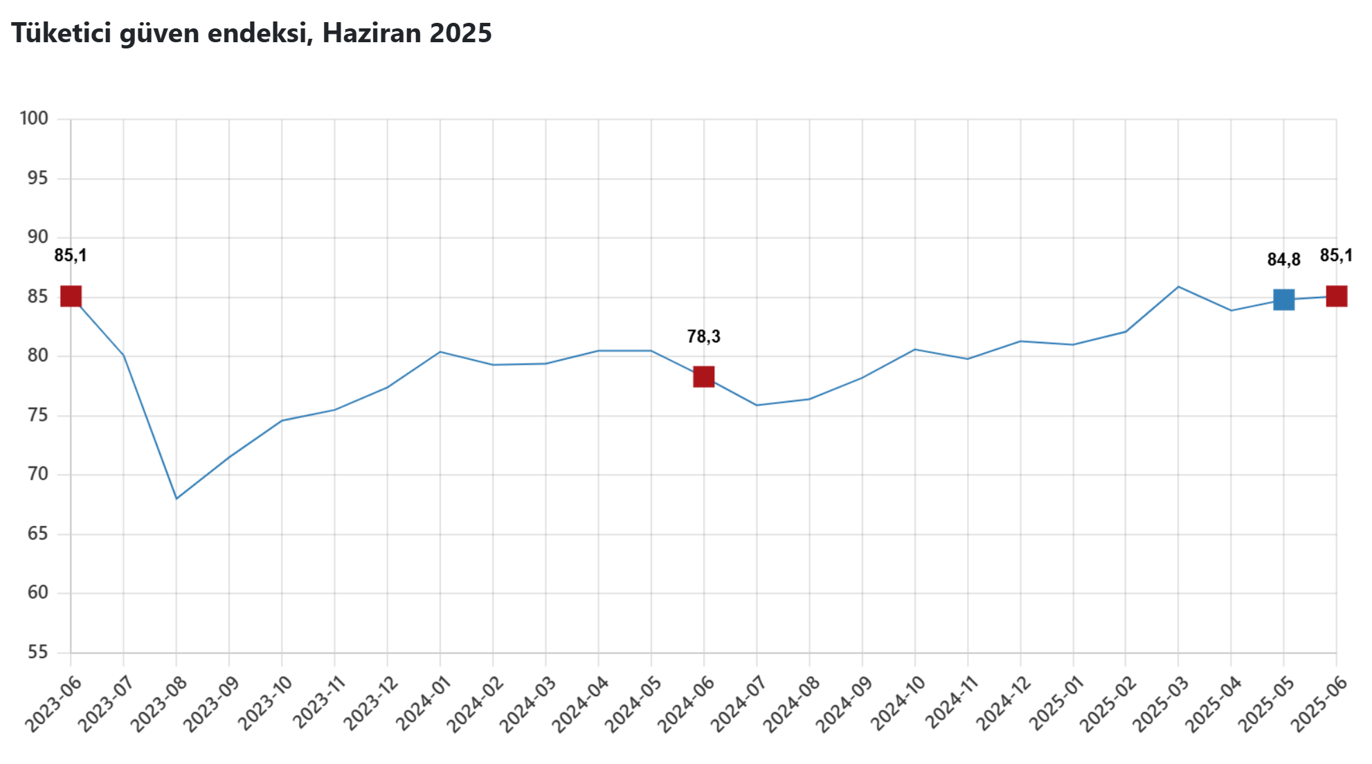 TÜİK verilerine göre tüketici güven endeksi haziranda aylık bazda yüzde 0,3 artışla 85,1 oldu. Türkiye İstatistik Kurumu (TÜİK), haziran ayına ilişkin tüketici güven endeksi verilerini açıkladı. Buna göre, TÜİK ve Türkiye Cumhuriyet Merkez Bankası işbirliğiyle yürütülen Tüketici Eğilim Anketi sonuçlarından hesaplanan tüketici güven endeksi, mayısta 84,8 iken bu ay yüzde 0,3 artışla 85,1 olarak kayıtlara geçti. Kaynak: TÜİK Mevcut dönemde hanenin maddi durumu endeksi yüzde 0,4 artarak 69,1'den 69,3'e çıktı. Gelecek 12 aylık dönemde hanenin maddi durum beklentisi endeksi mayısta 85,3 iken bu ay yüzde 0,6 artış kaydederek 85,8'e yükseldi. Geçen ay 82,2 olan gelecek 12 aylık dönemde genel ekonomik durum beklentisi endeksi yüzde 0,3 yükselişe bu ay 82,4 olarak hesaplandı. Gelecek 12 aylık dönemde dayanıklı tüketim mallarına harcama yapma düşüncesi endeksi ise geçen ay 102,5 iken bu ay yüzde 0,1 artışla 102,6'ya çıktı.