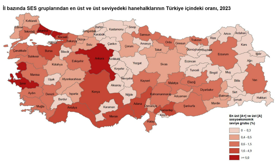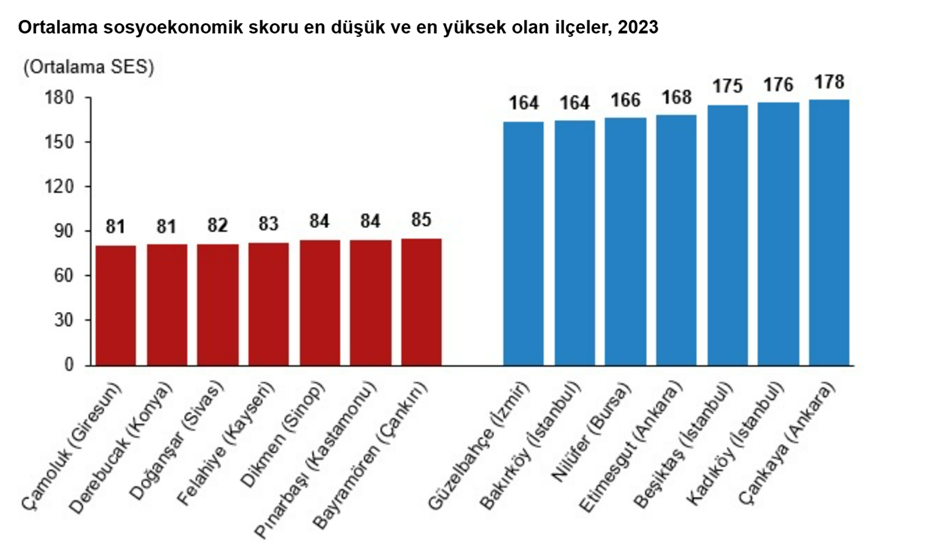 TÜİK’in ilk kez yayımladığı verilere göre Türkiye’de sosyoekonomik zenginliğin en yüksek olduğu il İstanbul, ilçe ise Çankaya (Ankara) olarak tespit edildi. Türkiye İstatistik Kurumu (TÜİK), ilk kez "Sosyoekonomik Seviye 2023" bültenini yayımladı. Bülten, hane halklarının sosyal ve ekonomik statüsünün birlikte ele alındığı bir ölçüm aracı olarak tanımlandı. Çalışmada idari kayıtlar kullanılarak, ülkedeki 26 milyondan fazla hanenin tamamı için sosyoekonomik seviye skoru hesaplandı. Hesaplamalarda 2022, 2023 ve 2024 yılı verileri kullanılırken referans dönemi orta yıl olan 2023 olarak adlandırıldı. Hane halklarının yüzde 16,7'si en alt seviyede Araştırma kapsamında, sosyoekonomik seviye gruplarına bakıldığında, Türkiye'deki hane halklarının yüzde 1,1'i en üst seviyede, yüzde 11'i üst, yüzde 16,4'ü üst altı, yüzde 19,7'si üst orta, yüzde 16,5'i alt orta, yüzde 18,6'sı alt ve yüzde 16,7'si en alt seviyede yer aldı. Kaynak: TÜİK İlde İstanbul, ilçede Çankaya lider İl düzeyinde en üst (A+) ve üst (A) sosyoekonomik seviye gruplarındaki hane halkları, Türkiye içindeki oranlarına göre sıralandığında, bu seviyelerdeki hane halklarının en fazla olduğu iller yüzde 28,6 ile İstanbul, yüzde 11,5 ile Ankara, yüzde 6,7 ile İzmir, yüzde 3,9 ile Bursa ve yüzde 3,3 ile Antalya çıktı. Söz konusu seviyelerdeki hane halklarının en fazla olduğu ilçeler ise sırasıyla yüzde 4,1 ile Çankaya (Ankara), yüzde 2,4 ile Kadıköy (İstanbul), yüzde 1,9 ile Yenimahalle (Ankara) olarak hesaplandı. Kaynak: TÜİK İlçeler ortalama sosyoekonomik seviyeye göre sıralandığında, skoru en yüksek 7 ilçenin sırasıyla Çankaya (Ankara), Kadıköy (İstanbul), Beşiktaş (İstanbul), Etimesgut (Ankara), Nilüfer (Bursa), Bakırköy (İstanbul) ve Güzelbahçe (İzmir) olduğu görüldü. Skoru en düşük 7 ilçe ise sırasıyla Çamoluk (Giresun), Derebucak (Konya), Doğanşar (Sivas), Felahiye (Kayseri), Dikmen (Sinop), Pınarbaşı (Kastamonu), Bayramören (Çankırı) olarak belirlendi. Kaynak: TÜİK