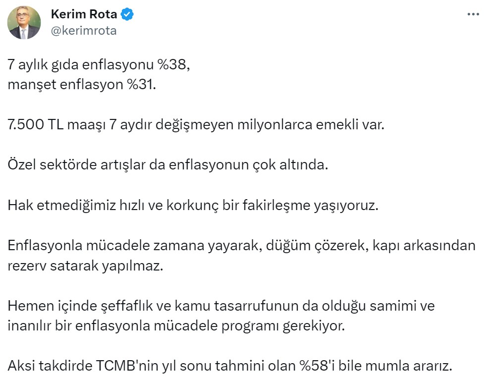 Türkiye İstatistik Kurumu’nun (TÜİK) temmuz ayına ilişkin enflasyon verilerini açıklamasının ardından ekonomistlerden de veriye ilişkin tepkiler gelmeye başladı. İşte TÜİK verilerine ekonomistlerin ilk tepkileri... Enflasyon Araştırma Grubu’nun (ENAG) açıkladığı verilere göre, temmuzda aylık enflasyon yüzde 13,18, yıllık enflasyon ise yüzde 122.88 olurken; TÜİK verilerine göre ise enflasyon aylık yüzde 9,49, yıllık yüzde 47,83 oldu. Aradaki derin makas ise TÜİK verilerine ekonomist ve siyasetçilerin tepki göstermesine sebep oldu. [news_id:702770] Ekonomistlerden gelen ilk tepkiler ise şöyle sıralandı: İris Cibre Prof. Dr. Hayri Kozanoğlu Kerim Rota