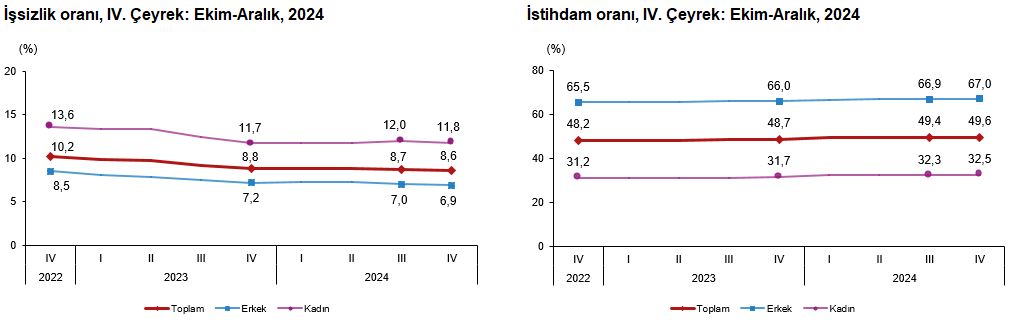 TÜİK verilerine göre geçtiğimiz yılın son çeyreğinde işsizlik oranı 0,1 puan azalışla yüzde 8,6'ya geriledi. Bu dönemde mevsim etkisinden arındırılmış işsiz sayısı 23 bin kişi azalarak 3 milyon 80 bin kişi olarak tespit edildi. Türkiye İstatistik Kurumu (TÜİK), Ekim-Aralık 2024 dönemine ilişkin iş gücü istatistiklerini açıkladı. Buna göre, Türkiye genelinde 15 ve daha yukarı yaştaki kişilerde mevsim etkisinden arındırılmış işsiz sayısı, geçen yılın dördüncü çeyreğinde bir önceki çeyreğe göre 23 bin kişi azalarak 3 milyon 80 bin kişi olarak tespit edildi. Mevsim etkisinden arındırılmış işsizlik oranı ise 0,1 puanlık azalışla yüzde 8,6 seviyesinde gerçekleşti. İşsizlik oranı, söz konusu dönemde 2023'ün aynı dönemine göre 0,2 puan azaldı. İşsizlik oranı erkeklerde yüzde 6,9, kadınlarda ise yüzde 11,8 olarak hesaplandı. Kaynak: TÜİK 15-24 yaş grubunu kapsayan genç nüfusta mevsim etkisinden arındırılmış işsizlik oranı geçen yılın 4. çeyreğinde, bir önceki çeyreğe göre 0,5 puanlık azalışla yüzde 16,1 oldu. Bu yaş grubunda işsizlik oranı erkeklerde yüzde 12,6, kadınlarda ise yüzde 22,5 olarak tahmin edildi. İstihdamda aslan payı hizmet sektöründe Mevsim etkisinden arındırılmış istihdam edilenlerin sayısı 2024 yılı IV. çeyreğinde bir önceki çeyreğe göre tarım sektöründe 86 bin kişi, sanayi sektöründe 82 bin kişi, inşaat sektöründe 9 bin kişi artarken hizmet sektöründe 36 bin kişi azaldı. İstihdam edilenlerin %14,8'i tarım, %20,8'i sanayi, %6,6'sı inşaat, %57,8'i ise hizmet sektöründe yer aldı. Haftalık çalışma süresi 42,8 saat oldu İstihdam edilenlerden referans döneminde işbaşında olanların, mevsim ve takvim etkilerinden arındırılmış haftalık ortalama fiili çalışma süresi 2024 yılı IV. çeyreğinde bir önceki çeyreğe göre 0,2 saat artarak 42,8 saat olarak gerçekleşti. Zamana bağlı eksik istihdam, potansiyel işgücü ve işsizlerden oluşan atıl işgücü oranı 2024 yılı IV. çeyreğinde bir önceki çeyreğe göre 1,4 puanlık artış ile yüzde 28,0 oldu. Zamana bağlı eksik istihdam ve işsizlerin bütünleşik oranı yüzde 18,5 iken potansiyel işgücü ve işsizlerin bütünleşik oranı yüzde 19,3 olarak tahmin edildi. Kaynak: TÜİK