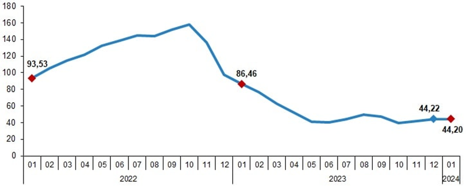 TÜİK verilerine göre üretici enflasyonu Ocak 2024'te bir önceki aya göre yüzde 4,14, bir önceki yılın aynı ayına göre yüzde 44,20 artış kaydetti. Türkiye İstatistik Kurumu (TÜİK) 2024 Ocak'a ilişkin Yurt İçi Üretici Fiyat Endeksini (Yİ-ÜFE) açıkladı. Yİ-ÜFE (2003=100) 2024 yılı Ocak ayında bir önceki aya göre yüzde 4,14, bir önceki yılın Aralık ayına göre yüzde 4,14, bir önceki yılın aynı ayına göre yüzde 44,20 ve on iki aylık ortalamalara göre yüzde 47,35 artış gösterdi. Kaynak: TÜİK Alt sektörlerde değişim Sanayinin dört sektörünün yıllık değişimleri; madencilik ve taş ocakçılığında yüzde 65,03 artış, imalatta yüzde 53,80 artış, elektrik, gaz üretimi ve dağıtımında yüzde 32,00 azalış, ve su temininde yüzde 66,35 artış olarak gerçekleşti. Sanayinin dört sektörünün aylık değişimleri; madencilik ve taş ocakçılığında yüzde 5,72 artış, imalatta yüzde 5,21 artış, elektrik, gaz üretimi ve dağıtımında yüzde 6,32 azalış ve su temininde yüzde 1,77 artış olarak gerçekleşti. Ana sanayi gruplarının değişimi Ana sanayi gruplarının yıllık değişimleri; ara malında yüzde 49,76 artış, dayanıklı tüketim malında yüzde 56,63 artış, dayanıksız tüketim malında yüzde 60,81 artış, enerjide yüzde 4,06 azalış ve sermaye malında yüzde 64,94 artış olarak gerçekleşti. Ana sanayi gruplarının aylık değişimleri; ara malında yüzde 4,89 artış, dayanıklı tüketim malında yüzde 5,04 artış, dayanıksız tüketim malında yüzde 5,85 artış, enerjide yüzde 3,04 azalış ve sermaye malında yüzde 6,21 artış olarak gerçekleşti.