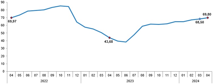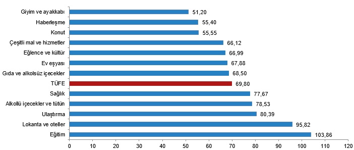 Türkiye İstatistik Kurumu (TÜİK), nisan ayına ilişkin resmi enflasyon rakamlarını açıkladı. TÜİK verilerine göre enflasyon nisan ayında yıllık bazda yüzde 69,80 artış kaydetti. Bu döneme ilişkin piyasaların genel beklentisi ise enflasyonun yüzde 70,33 seviyesinde gerçekleşmesi yönündeydi. Kaynak: TÜİK Aylık bazda beklenti yüzde 3,40 seviyesinde olurken, aylık artış ise yüzde 3,18 olarak kayıtlara geçti. Bir önceki yılın aynı ayına göre en az artış gösteren ana grup %51,20 ile giyim ve ayakkabı oldu. Buna karşılık, bir önceki yılın aynı ayına göre artışın en yüksek olduğu ana grup ise %103,86 ile eğitim oldu. Kaynak: TÜİK Ana harcama grupları itibarıyla 2024 yılı Nisan ayında bir önceki aya göre en az artış gösteren ana grup %1,03 ile sağlık oldu. Buna karşılık, 2024 yılı Nisan ayında bir önceki aya göre artışın en yüksek olduğu ana grup ise %9,56 ile alkollü içecekler ve tütün oldu. Kaynak: TÜİK Endekste kapsanan 143 temel başlıktan (Amaca Göre Bireysel Tüketim Sınıflaması-COICOP 5'li Düzey) 2024 yılı Nisan ayı itibarıyla, 13 temel başlığın endeksinde düşüş gerçekleşirken, 7 temel başlığın endeksinde değişim olmadı. 123 temel başlığın endeksinde ise artış gerçekleşti. Özel kapsamlı TÜFE göstergesi yıllık %72,72, aylık %3,24 oldu İşlenmemiş gıda ürünleri, enerji, alkollü içkiler ve tütün ile altın hariç TÜFE'deki değişim, 2024 yılı Nisan ayında bir önceki aya göre %3,24, bir önceki yılın Aralık ayına göre %18,58, bir önceki yılın aynı ayına göre %72,72 ve on iki aylık ortalamalara göre %64,57 olarak gerçekleşti. ENAG ve İTO'nun enflasyon hesabı Enflasyon Araştırma Grubu’nun (ENAG) hesaplamalarına göre ise enflasyon (E-TÜFE) nisan ayında aylık bazda yüzde 5,02, yıllık bazda ise yüzde 124,35 artış gösterdi. İstanbul Ticaret Odası (İTO) ise çarşamba günü İstanbul'da perakende fiyatların aylık bazda yüzde 4,89, yıllık bazda ise yüzde 78,81 artış kaydettiğini bildirmişti. [news_id:731752] [news_id:731730]
