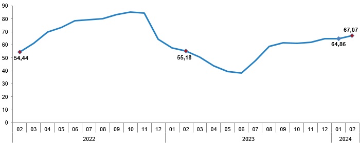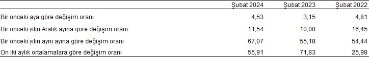 Türkiye İstatistik Kurumu (TÜİK) şubat ayına yönelik resmi enflasyon rakamlarını açıkladı. TÜİK, tüketici fiyat endeksi (TÜFE) verilerinin yıllık yüzde 67,07, aylık bazda ise yüzde 4,53 oranında arttığını açıkladı. ENAG verilerine göre ise, Tüketici Fiyat Endeksi (E-TÜFE) şubat ayında yüzde 4.32 E-TÜFE’nin son 12 aylık artışı da yüzde 121.98 olarak gerçekleşmişti. TÜFE'deki (2003=100) değişim 2024 yılı Şubat ayında bir önceki aya göre %4,53, bir önceki yılın Aralık ayına göre %11,54, bir önceki yılın aynı ayına göre %67,07 ve on iki aylık ortalamalara göre %55,91 olarak gerçekleşti. TÜFE değişim oranları (%), Şubat 2024 TÜFE yıllık değişim oranları (%), Şubat 2024 Bir önceki yılın aynı ayına göre en az artış gösteren ana grup %43,44 ile giyim ve ayakkabı oldu. Buna karşılık, bir önceki yılın aynı ayına göre artışın en yüksek olduğu ana grup ise %94,78 ile lokanta ve oteller oldu. TÜFE ana harcama gruplarına göre yıllık değişim oranları (%), Şubat 2024 Ana harcama grupları itibarıyla 2024 yılı Şubat ayında bir önceki aya göre en az artış gösteren ana grup %0,20 ile giyim ve ayakkabı oldu. Buna karşılık, 2024 yılı Şubat ayında bir önceki aya göre artışın en yüksek olduğu ana grup ise %12,76 ile eğitim oldu (ana harcama gruplarına göre endeksler, ağırlıklar ve değişim oranları Ek Tablo-1'dedir). TÜFE ana harcama gruplarına göre aylık değişim oranları (%), Şubat 2024 Endekste kapsanan 143 temel başlıktan (Amaca Göre Bireysel Tüketim Sınıflaması-COICOP 5'li Düzey) 2024 yılı Şubat ayı itibarıyla, 12 temel başlığın endeksinde düşüş gerçekleşirken, 6 temel başlığın endeksinde değişim olmadı. 125 temel başlığın endeksinde ise artış gerçekleşti. Özel kapsamlı TÜFE göstergesi (B) yıllık %70,31, aylık %4,23 oldu İşlenmemiş gıda ürünleri, enerji, alkollü içkiler ve tütün ile altın hariç TÜFE'deki değişim, 2024 yılı Şubat ayında bir önceki aya göre %4,23, bir önceki yılın Aralık ayına göre %11,37, bir önceki yılın aynı ayına göre %70,31 ve on iki aylık ortalamalara göre %60,96 olarak gerçekleşti. Özel kapsamlı TÜFE göstergeleri ve değişim oranları (%), Şubat 2024 TÜİK geçtiğimiz şubat ayında yayınladığı verilerinde ise, ocak ayı enflasyonunun yıllık bazda yüzde 64,86, aylık bazda da yine yüzde 6,70 artışla geçtiğini kayıtlara geçirmişti. Yine aynı döneme ilişkin Enflasyon Araştırma Grubu’nun (ENAG) istatistiklerine göre ise enflasyon (E-TÜFE) ocak ayında aylık bazda yüzde 9,38, yıllık bazda ise yüzde 129,11 artış göstermişti. Benzer şekilde, İstanbul Ticaret Odası (İTO) ise hafta içi İstanbul'da perakende fiyatların ocakta aylık bazda yüzde 6,72, yıllık bazda ise yüzde 76,17 artış kaydettiğini bildirmişti.