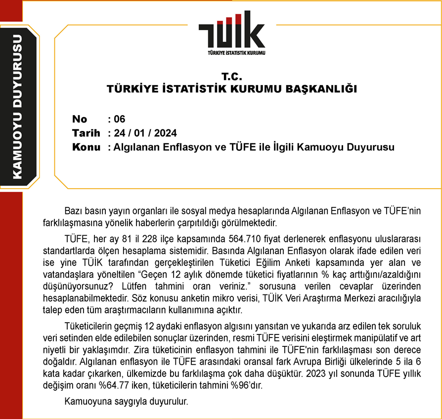 TÜİK, algılanan enflasyon ve TÜFE farklılaşmasına ilişkin yaptığı açıklamada, "Resmi TÜFE verisini eleştirmek manipülatif ve art niyetli bir yaklaşımdır. Zira tüketicinin enflasyon tahmini ile TÜFE'nin farklılaşması son derece doğaldır" ifadelerini kullandı. Türkiye İstatistik Kurumu, (TÜİK) algılanan enflasyon ile TÜFE arasındaki farklılaşmaya ilişkin yazılı bir açıklama yaptı. 2023 yıl sonunda TÜFE yıllık değişim oranının %64,77, tüketicilerin tahmininin %96 olduğu belirtilen açıklamada, "Tüketicilerin geçmiş 12 aydaki enflasyon algısını yansıtan ve tek soruluk veri setinden elde edilebilen sonuçlar üzerinden, resmi TÜFE verisini eleştirmek manipülatif ve art niyetli bir yaklaşımdır. Zira tüketicinin enflasyon tahmini ile TÜFE'nin farklılaşması son derece doğaldır" ifadeleri kullanıldı. TÜİK'in açıklamasının tamamı ise şu şekilde oldu: "Bazı basın yayın organları ile sosyal medya hesaplarında Algılanan Enflasyon ve TÜFE'nin farklılaşmasına yönelik haberlerin çarpıtıldığı görülmektedir. TÜFE, her ay 81 il 228 ilçe kapsamında 564.710 fiyat derlenerek enflasyonu uluslararası standartlarda ölçen hesaplama sistemidir. Basında Algılanan Enflasyon olarak ifade edilen veri ise yine TÜİK tarafından gerçekleştirilen Tüketici Eğilim Anketi kapsamında yer alan ve vatandaşlara yöneltilen 'Geçen 12 aylık dönemde tüketici fiyatlarının % kaç arttığını/azaldığını düşünüyorsunuz? Lütfen tahmini oran veriniz' sorusuna verilen cevaplar üzerinden hesaplanabilmektedir. Söz konusu anketin mikro verisi, TÜİK Veri Araştırma Merkezi aracılığıyla talep eden tüm araştırmacıların kullanımına açıktır. Tüketicilerin geçmiş 12 aydaki enflasyon algısını yansıtan ve yukarıda arz edilen tek soruluk veri setinden elde edilebilen sonuçlar üzerinden, resmi TÜFE verisini eleştirmek manipülatif ve art niyetli bir yaklaşımdır. Zira tüketicinin enflasyon tahmini ile TÜFE'nin farklılaşması son derece doğaldır. Algılanan enflasyon ile TÜFE arasındaki oransal fark Avrupa Birliği ülkelerinde 5 ila 6 kata kadar çıkarken, ülkemizde bu farklılaşma çok daha düşüktür. 2023 yıl sonunda TÜFE yıllık değişim oranı %64.77 iken, tüketicilerin tahmini %96'dır. Kamuoyuna saygıyla duyurulur." Kaynak: TÜİK