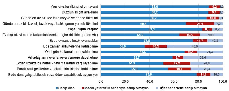 TÜİK verilerinde maddi yetersizlik nedeniyle geçen yıl 100 çocuktan 10'unun günlük olarak taze meyve ve sebze yiyemediği aktarıldı. Türkiye İstatistik Kurumu (TÜİK) "Çocuk Sağlığı ve Yoksunluğu" adlı çalışma yayımladı. 2024 yılında Gelir ve Yaşam Koşulları Araştırması verilerinden derlenen çalışmada, hanelerdeki 15 yaş ve altındaki tüm çocukların sağlık ve yoksunluk durumları tespit edildi. Çocukların genel sağlık durumu incelendiğinde; yüzde 94,5'inin "İyi veya çok iyi", yüzde 4,6'sının "Orta", yüzde 0,9'unun ise "Kötü veya çok kötü" düzeyde olduğu beyan edildi. Sağlık durumu çocukların yaş gruplarına göre incelendiğinde 0-5 yaş grubundakilerin yüzde 95,1'inin, 6-11 yaş grubundakilerin yüzde 94,7'sinin, 12-15 yaş grubundakilerin ise yüzde 93,5'inin "İyi veya çok iyi" durumda olduğu tahmin edildi. En düşük yaş grubu olan 0-5 yaş grubu çocukların yüzde 0,7'sinin, 6-11 yaş grubu çocukların yüzde 0,9'unun, 12-15 yaş grubu çocukların ise yüzde 1,0'ının sağlık durumu "Kötü veya çok kötü" olarak tespit edildi. Sağlık durumu "Kötü veya çok kötü" olan çocuklar Sağlık durumu "Kötü veya çok kötü" olan çocukların yüzde 53,7'sinin en az son 6 aydır yaşanan bir sağlık problemi nedeniyle günlük faaliyetlerinin çok sınırlandığı, yüzde 40,9'unun faaliyetlerinin sınırlandığı, yüzde 5,4'ünün ise faaliyetlerinin sınırlanmadığı belirtildi. Maddi yetersizlik nedeniyle yeni giysilere sahip olamayan çocuklar Anket sonuçlarına göre; 15 yaş ve altı tüm çocukların yeni giysilere sahip olduğu hanehalkı oranı yüzde 88,6 iken maddi yetersizlik nedeniyle çocukları yeni giysilere sahip olmayan hanehalkı oranı yüzde 9,2, diğer nedenlerle sahip olmayan hanehalkı oranı ise yüzde 2,2 olarak gerçekleşti. Taze meyve yiyemeyen çocuklar Hanehalkında yaşayan tüm 15 yaş ve altı çocukları günde en az bir kez taze meyve ve sebze tüketen hanehalkı oranı yüzde 86,7 iken maddi yetersizlik nedeniyle çocukları günde en az bir kez taze meyve ve sebze tüketemeyen hanehalkı oranı yüzde 10,0, diğer nedenlerle tüketemeyen hanehalkı oranı ise yüzde 3,3 olarak tahmin edildi. Çocukları için evden uzakta bir haftalık tatil masrafını karşılayabilen hanehalkı oranı yüzde 51,2 iken maddi yetersizlik nedeniyle evden uzakta bir haftalık tatil masrafını karşılayamayan hanehalkı oranı yüzde 22,2, diğer nedenlerle karşılayamayan hanehalkı oranı ise yüzde 26,6 olarak gerçekleşti. Kaynak: TÜİK Ders çalışılabilecek uygun yeri olmayan çocuklar Anket sonuçlarına göre; 15 yaş ve altı tüm çocukların maddi yetersizlik nedeniyle evde ders çalışılabilecek veya ödev yapabilecek uygun yeri olmayan hanehalklarından yüzde 80,8'inin, evde oynayabilecek oyuncakları olmayan hanehalklarından yüzde 81,0'ının, yaşlarına uygun kitap olmayan hanehalklarından ise yüzde 81,1'inin, en yüksek eğitime sahip ebeveynin eğitimi lise altı düzeyde olduğu görüldü.