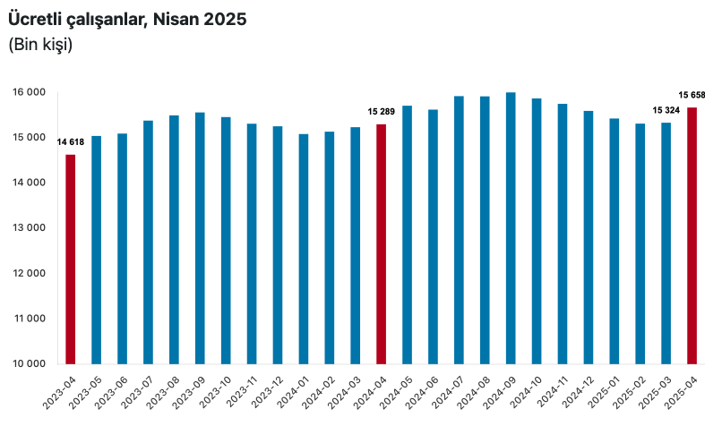 2025 yılı Nisan ayında ücretli çalışan sayısı bir önceki aya göre yüzde 0,7 oranında artış gösterdi. Söz konusu artış aylık bazda sanayi sektöründe yüzde 0,4, inşaatta yüzde 2,4 ve ticaret-hizmette yüzde 0,6 oldu.