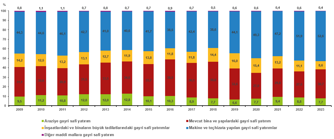 TÜİK verilerine göre Türkiye'de 2023'te maddi mallara 4 trilyon 193 milyar liralık gayrisafi yatırım harcaması yapıldı. Türkiye İstatistik Kurumu (TÜİK), 2023'e ilişkin yıllık sanayi ve hizmet istatistikleri yatırım harcamalarını açıkladı. Buna göre, 2009-2023 yıllarını kapsayacak şekilde hazırlanan çalışmada, maddi mallara ilişkin gayrisafi yatırım harcama türleri hesaplanarak ilk defa bülten olarak kamuoyu ile paylaşıldı. Bültenle, girişimlerin mali verileri kullanılarak, maddi mallara ilişkin arazi, mevcut bina ve yapılar, inşaatlar ve binaların büyük tadilatları ile makine ve teçhizatlara ilişkin gayrisafi yatırım değişkenleri hesaplandı. Maddi mallara ilişkin gayrisafi yatırım harcamaları 2023'te 4 trilyon 193 milyar lira oldu. Bunların 1 trilyon 330 milyar lirası imalat, 602 milyar lirası toptan ve perakende ticaret, 543 milyar lirası ulaştırma ve depolama sektöründe faaliyet gösteren girişimler tarafından gerçekleştirildi. Söz konusu yılda makine ve teçhizata 2 trilyon 206 milyar lira, mevcut bina ve yapılara 1 trilyon 287 milyar lira, inşaatlardaki ve binaların büyük tadilatlarına 361 milyar lira, araziye 323 milyar lira ve diğer maddi mallara 17 milyar lira yatırım harcaması yapıldı. Yatırımlar içindeki en yüksek payı makine ve teçhizat aldı Maddi mallara ilişkin gayrisafi yatırım harcamaları içindeki en yüksek pay, makine ve teçhizata yapılan yatırımların oldu. Bu alana yapılan yatırımların toplam içindeki payı 2022'de yüzde 51,9 iken, 2023'te yüzde 52,6 olarak gerçekleşti. Yatırım harcamaları içindeki payın en yüksek olduğu ikinci alan yüzde 30,7 ile mevcut bina ve yapıları olarak kayıtlara geçti. Kaynak: TÜİK